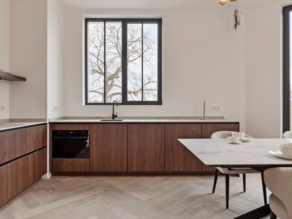 Dit hoekappartement wordt met aandacht voor detail afgewerkt en beschikt over een open keuken met aansluitend een lichtrijke woonkamer. De keuken is uitgerust met moderne apparatuur, waaronder een koelkast, vriezer, inductiekookplaat, afzuigkap, vaatwasser en combi-oven.