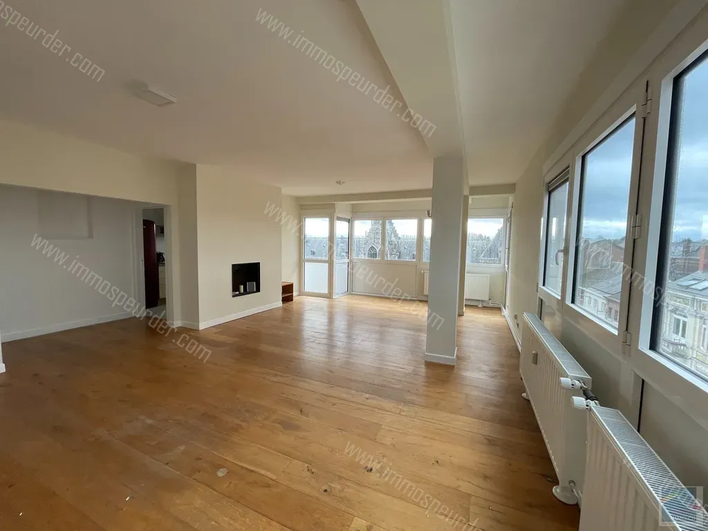 *living avec parquet au sol de +/- 48 m2 (y compris la petite alcove avec niche entre le living et la cuisine) et s'ouvrant sue une petite terrasse de +/- 4m2, offrant une magnifique vue sur la gare de Binche