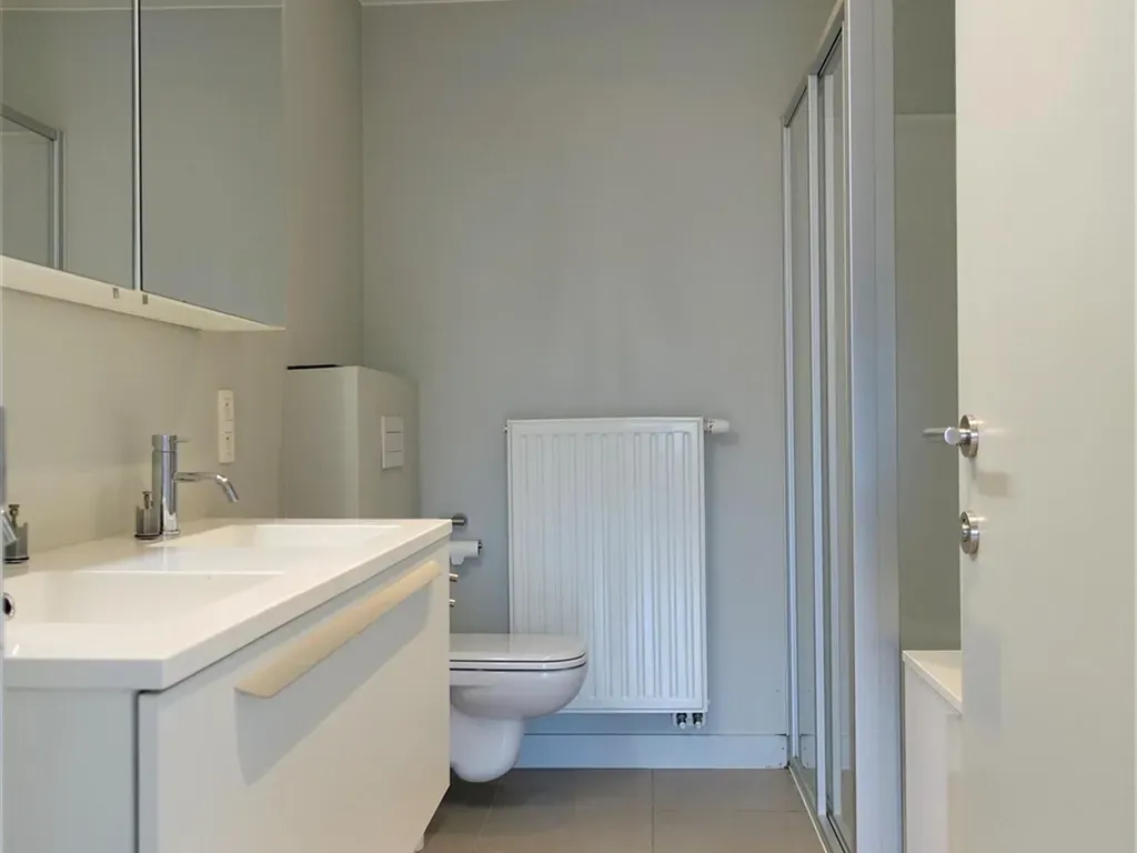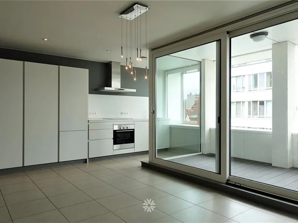 Het appartement bevindt zich op de vierde verdieping van het gebouw, met dubbele lift. Omvat: Inkomhal met vestiaire kasten en apart toilet, leefruimte met blokjesparket, open eetruimte met ingerichte keuken (kookvuur, dampkap, oven, koelkast met vriesvak, vaatwasmachine) en praktische ruime berging (aansluiting wasmachine). De hal biedt toegang tot 2 slaapkamers (waarvan 1 met ingemaakte kasten) en badkamer (met bad, douche en dubbel wasmeubel). Verlichting en deel gordijnen is voorzien.