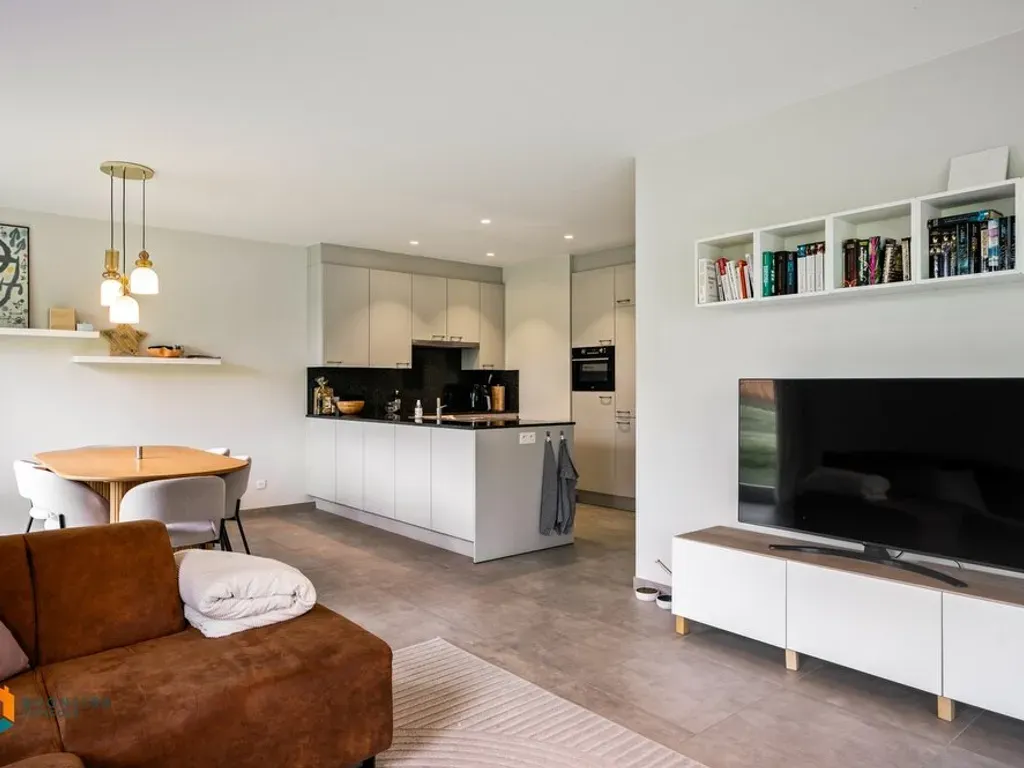 We betreden het appartement via de inkomhal met vestiaire en apart toilet. De leefruimte geniet van veel lichtinval door de vele raampartijen. Hier is de open keuken met eiland mooi geïntegreerd in het geheel en voorzien van de voornaamste toestellen. Verder geeft de hal ons toegang tot de berging/wasruimte, 2 slaapkamers en de badkamer, uitgerust met lavabo en inloopdouche. Op het zuid-gerichte terras met leuke onderhoudsarme tuin kunt u steeds in alle rust en privacy genieten van het mooie weer. U beschikt ook nog over een kelderberging en een ondergrondse autostaanplaats. Het gehele appartement is reeds geschilderd en voorzien van vliegenramen en screens. €80 gemeenschappelijke kost per maand.