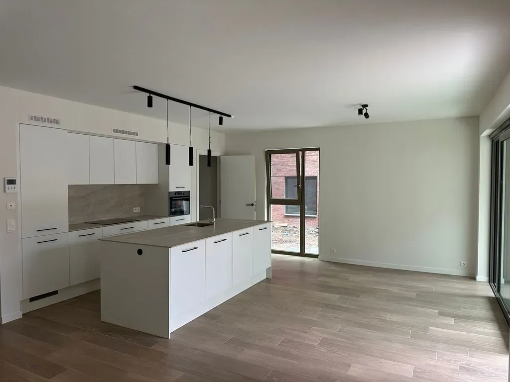 Het pronkstuk van het appartement is de lichtrijke leefruimte met open keuken. De vele ramen laten het licht heerlijk binnenvallen. Het grote schuifraam geeft toegang tot het grote overdekte terras met aansluitend een aangelegde gemeenschappelijke tuin. De keuken met kookeiland is volledig geïnstalleerd en doordacht afgewerkt met warme materialen. Naast de keuken bevindt zich een berging met aansluiting voor een wasmachine.