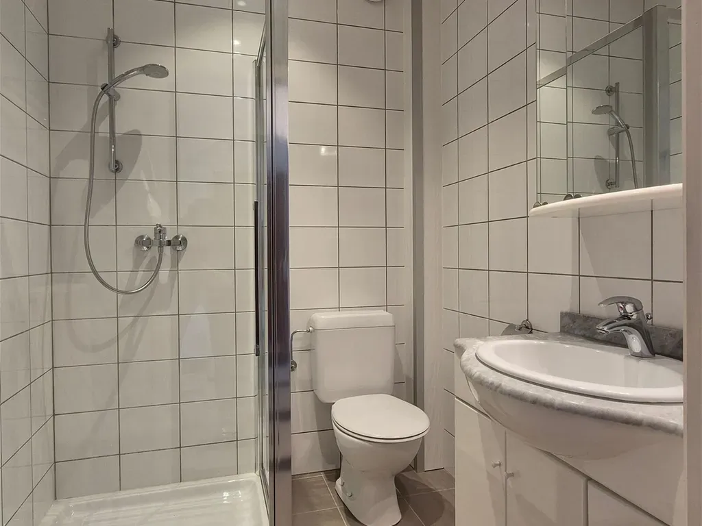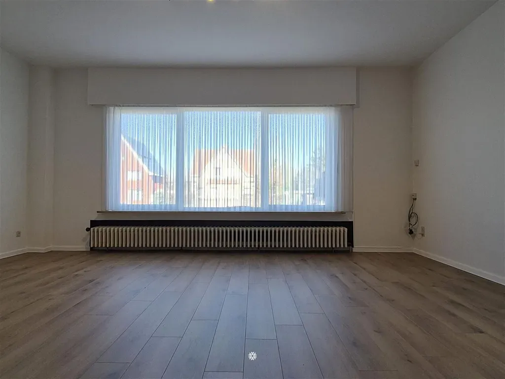 Inkomhal, ruime lichtrijke woonkamer, ingerichte keuken (oven, kookvuur, dampkap, koelkast), ingerichte badkamer (toilet, lavabo en douche),