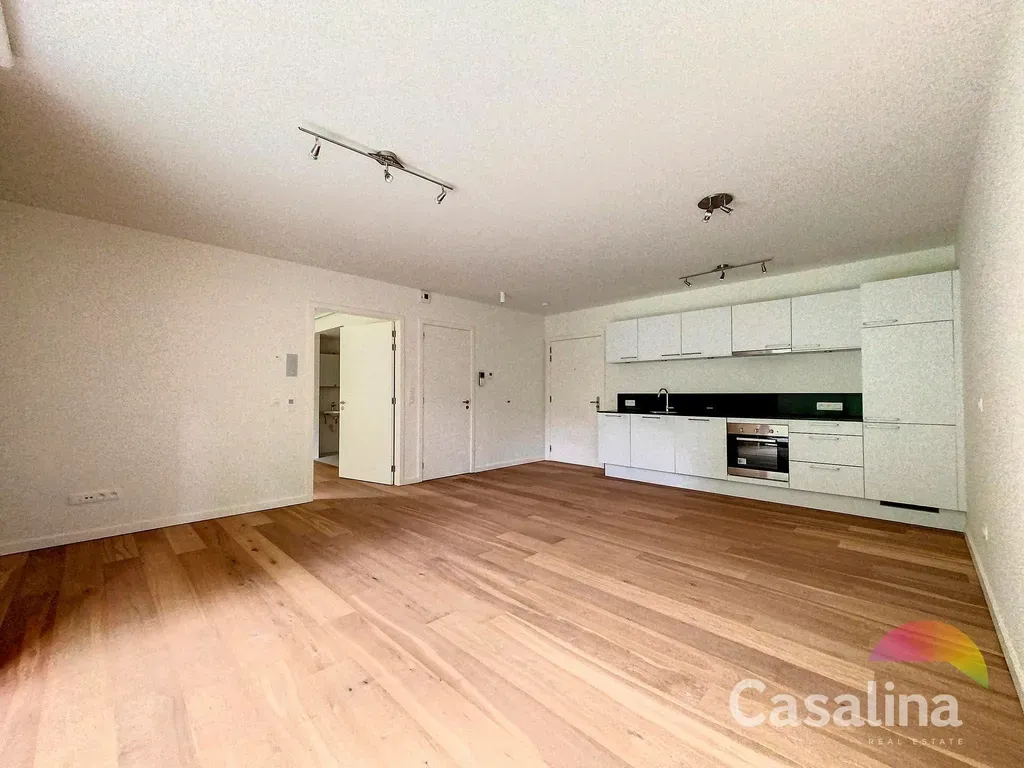 Indeling van het appartement : Het appartement omvat een woonkamer van 31m², een volledig uitgeruste keuken, een slaapkamer van 15m² met parketvloer, 1 toilet, een douchekamer, een berging met individuele gasverwarming en overal vloerverwarming.