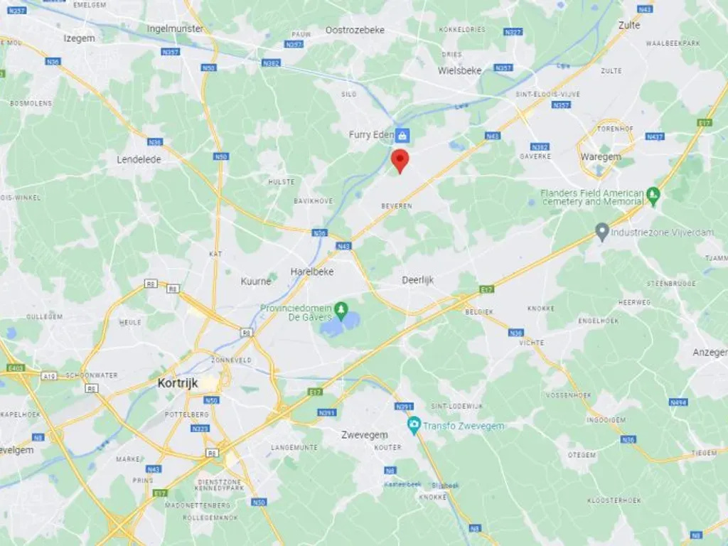 De site ligt op 7,6km van het op- en afrittencomplex van de E17 – Waregem. Dus een zeer goede ligging, makkelijk bereikbaar met de (vracht)wagen én openbaar vervoer. Deze straat typeert zich voornamelijk door enkele grote bedrijfsgebouwen en agrarische gronden.