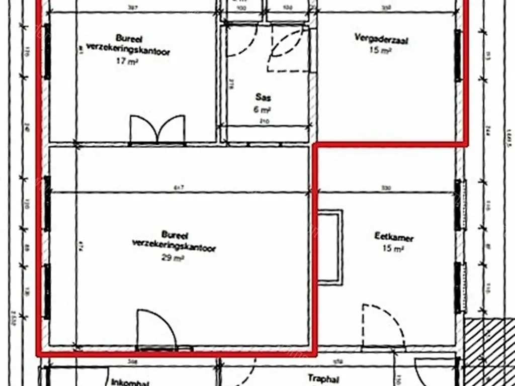 Inkom, twee kantoorruimtes, twee toiletten, opbergruimte, vergaderzaal