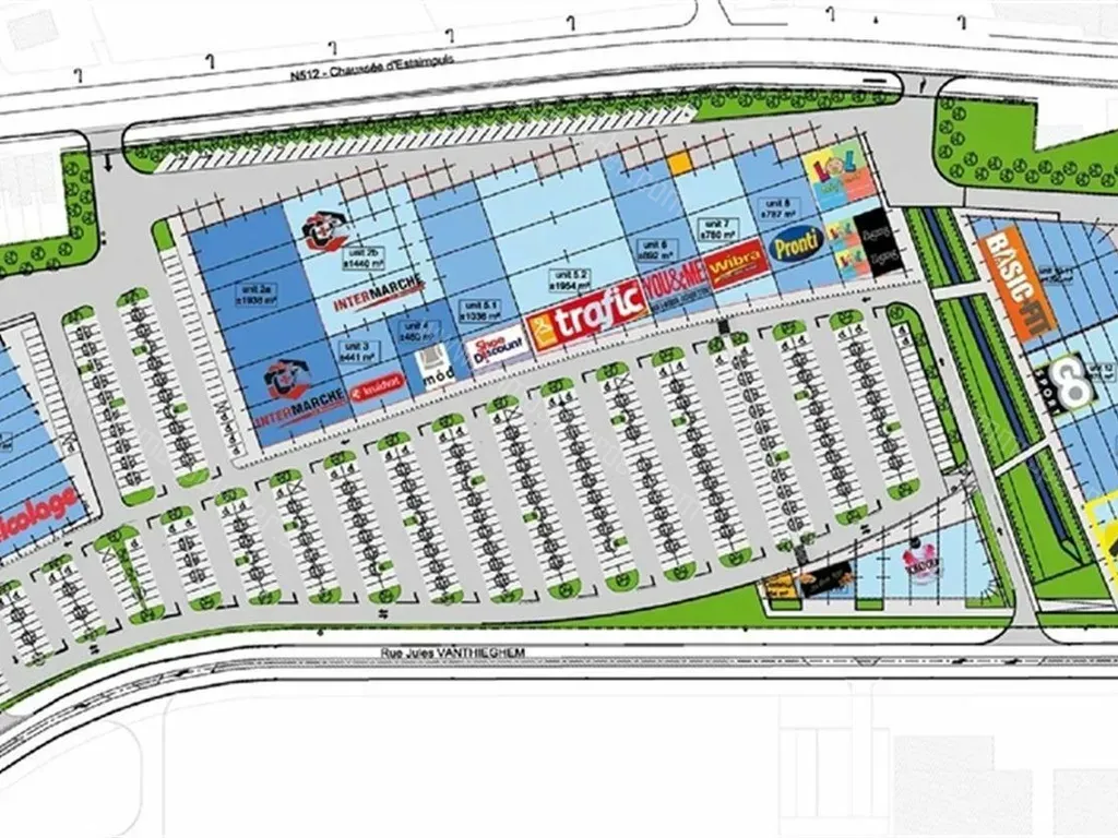 Enseignes in het retailpark: Intermarché, Trafic, Pronti, Kruidvat, Wibra, Zigzag, Basic Fit, Mr. Bricolage, enz.