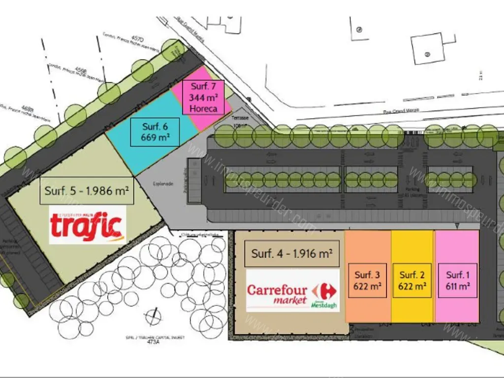 Chaussée Victor Lampe 50 - 7860 Lessines - In een gebouw van ongeveer 6800 m² winkels met ongeveer 150 parkeerplaatsen. Ligging langs de N57, goed zicht vanaf de weg. Ligging aan de rand van de stad en aan de rand van een zeer drukke rijksweg (het gemiddelde dagelijkse verkeer ter plaatse wordt geraamd op 11.769 auto's). Ketens die al hebben getekend: Carrefour Market en Trafic.