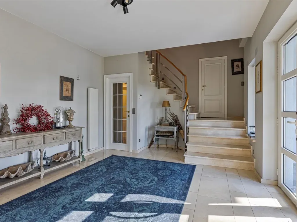 U komt binnen in een uitnodigende inkomhal. Vervolgens betreedt u de royale leefruimte en volledig geïnstalleerde keuken. De volledige benedenverdieping geniet van zeer veel lichtinval dankzij de talrijke raampartijen en biedt een schitterend uitzicht op de Leie.