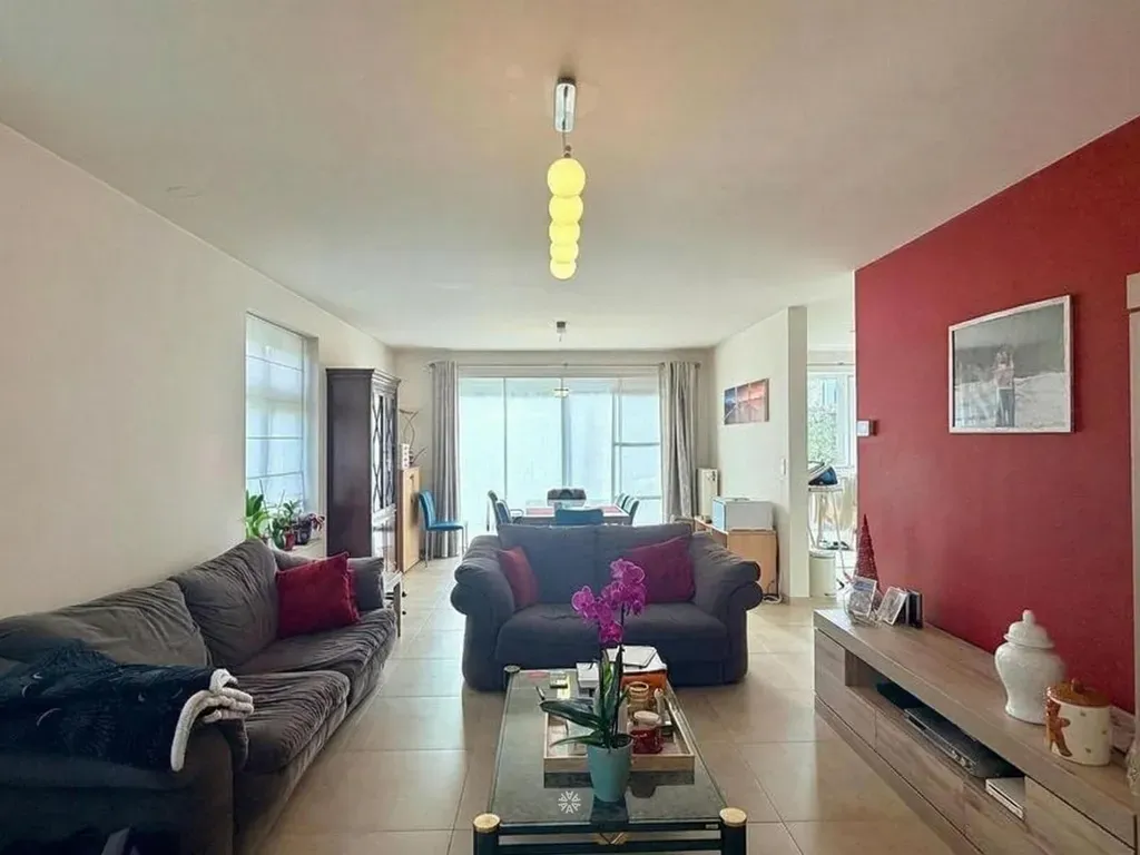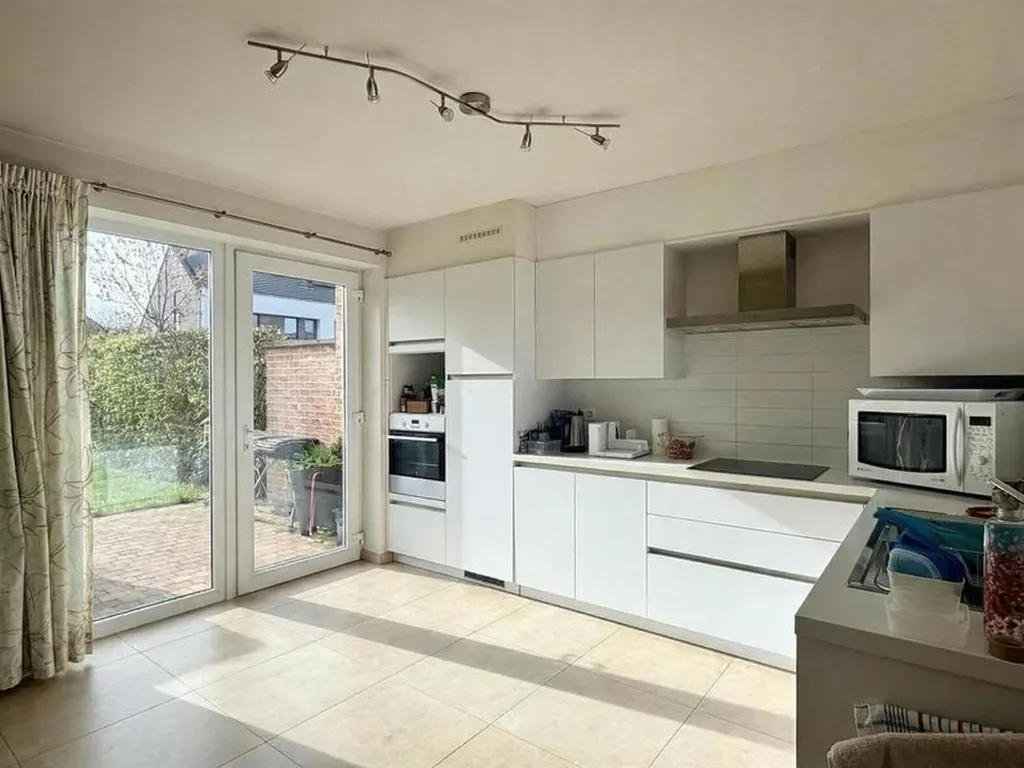Inkomhal met gastentoilet, ruime en lichtrijke leefruimte, open keuken met schuifraam naar de tuin en aansluitend toegang tot de inpandige garage.