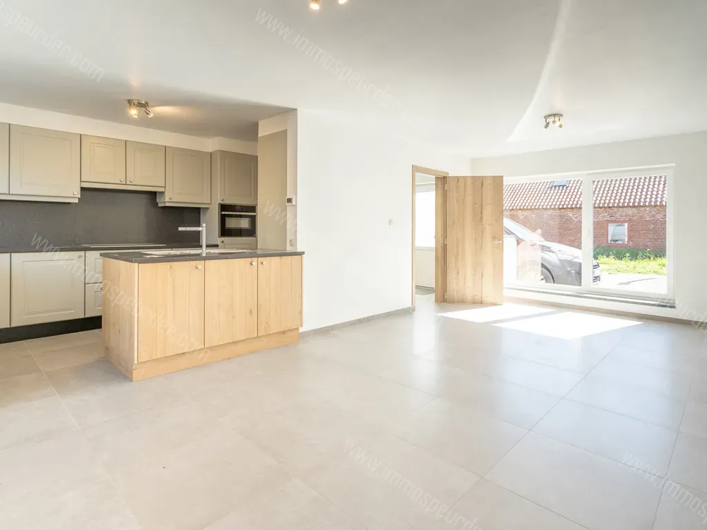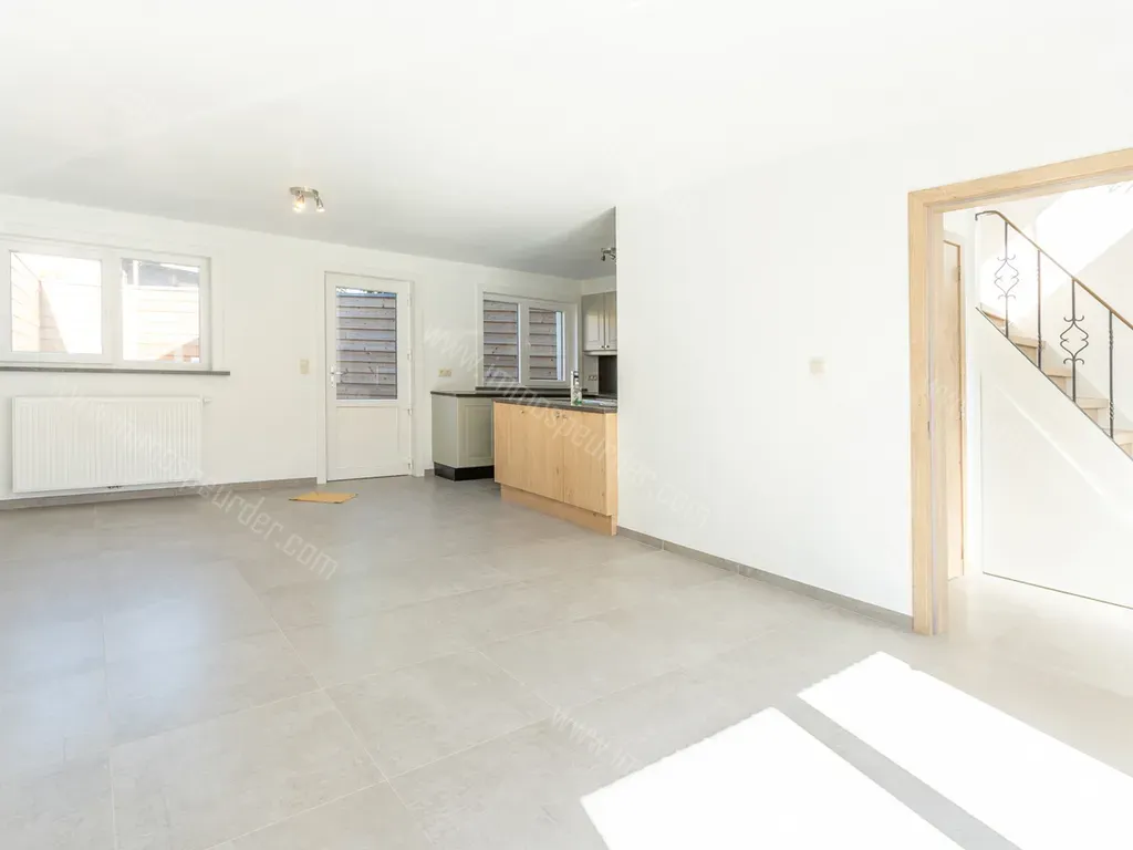 Inkomhal op tegel met trap naar de verdieping. Leefruimte ca. 30m² op tegel met open keuken ca. 6m² De keuken is uitgerust met een kookvuur, dampkap, vaatwasser, oven, koelkast, spoelbak en kookeiland. Achteraan is toegang tot het terras.