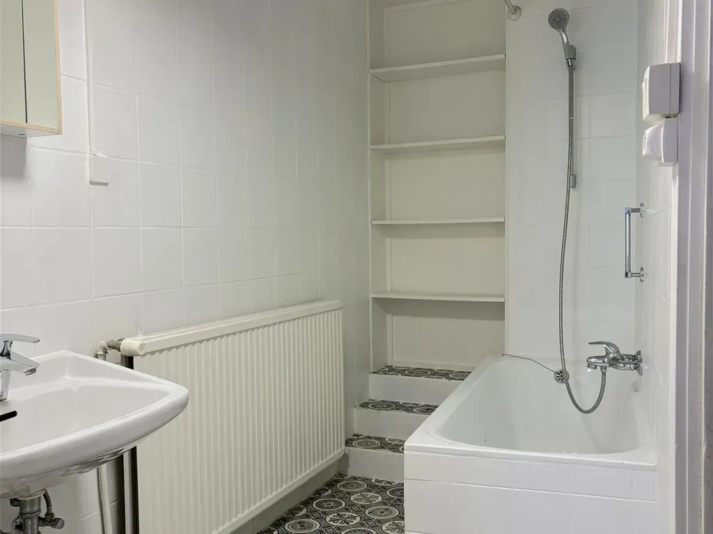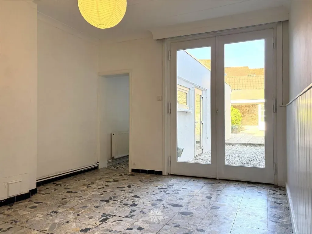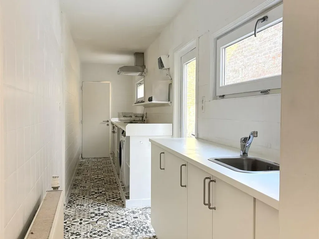 Inkomhal, leefruimte, eerste badkamer (lavabo en badmeubel), eetruimte met aansluitend de volledig geïnstalleerde keuken en toilet, gezellige stadstuin.