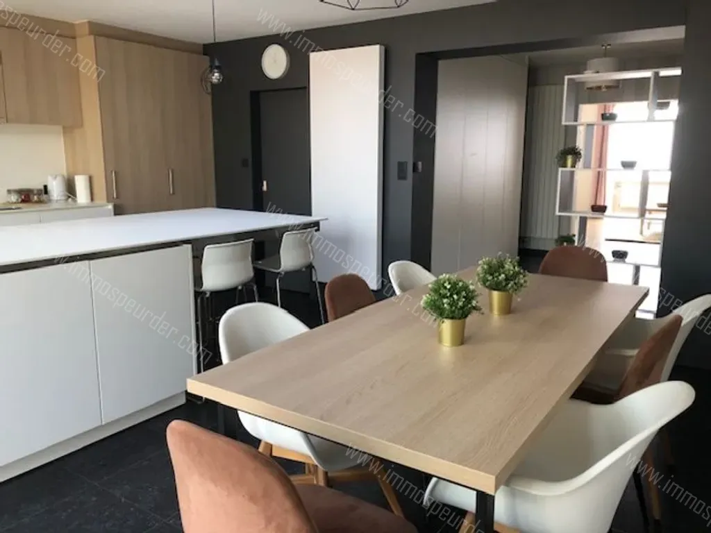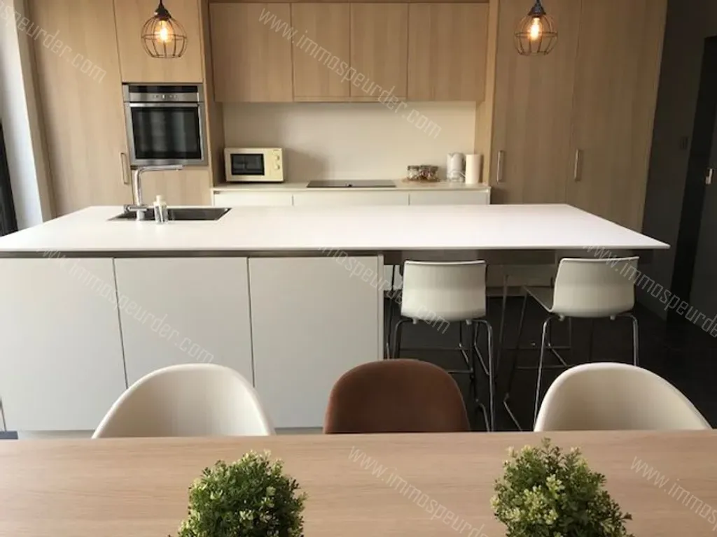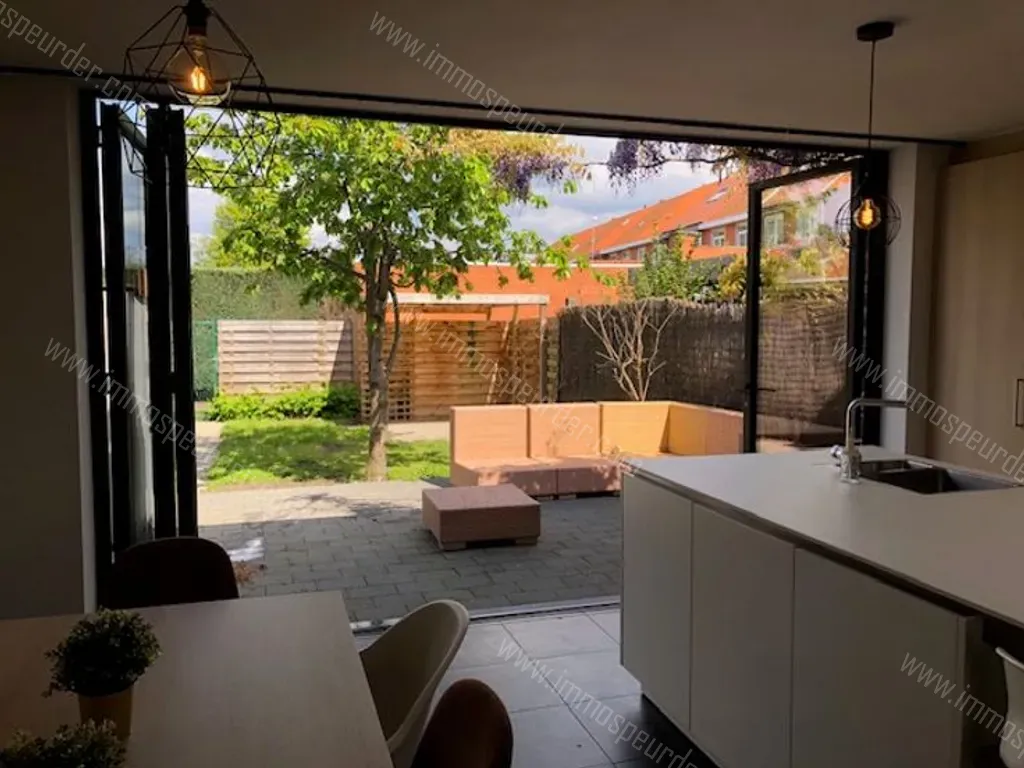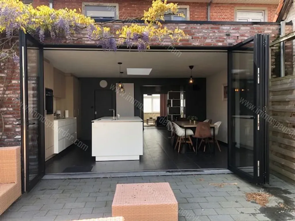 Gelijkvloers: inkomhal, leefruimte, bureelruimte, 10 hoge inbouwkasten, apart toilet met lavabo, keukenruimte van 30m2! Moderne nieuwe keuken (2018) met vaatwasser, oven frigo, groot keukeneiland uit composiet steen met tafel en krukken, eettafel met 8 stoelen. Afzonderlijke berging met aansluiting voor diepvries, wasmachine en droogkas en voldoende voorraadkasten. De achterkant is voorzien van ramen in harmonicasysteem hetgeen de keuken verbindt met het terras en de tuin (60m2) waardoor het buitengevoel naar binnen komt. Op het terras is een loungeset en een houten bergplaats voor vuilzakken en groencontainer te plaatsen en een tuinkast mèt grasmachine. Achteraan in de tuin is er een knus afdak met fietsenstalling en toegang tot het servitude pad.