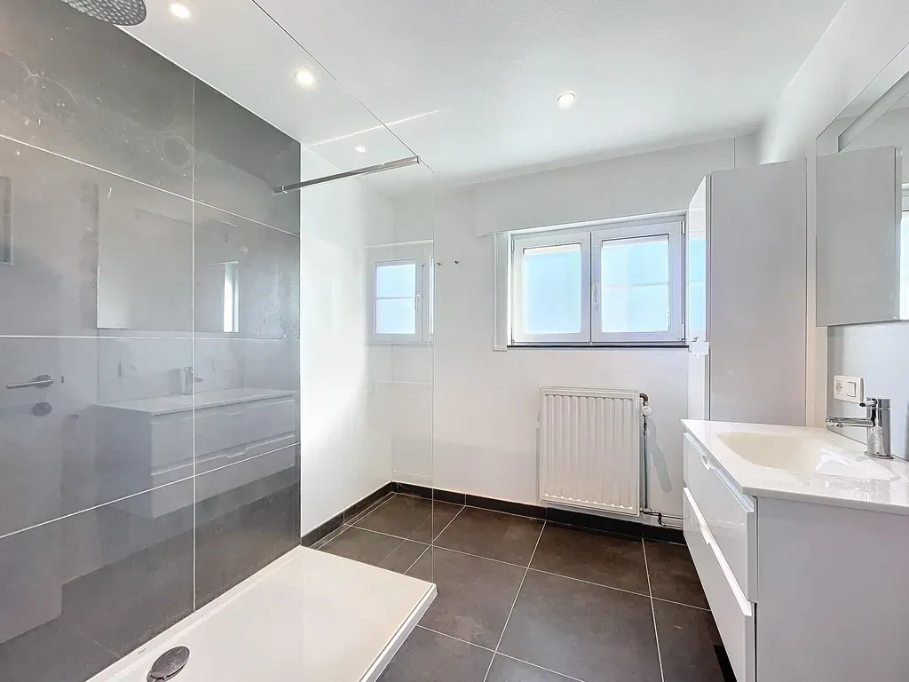 Indeling: inkom, ruime bergruimte/wasplaats, keuken, eetplaats, leefruimte, tuin met overdekt terras, 2 aparte toiletten, 2 slaapkamers, badkamer met inloopdouche, ruime zolder.
