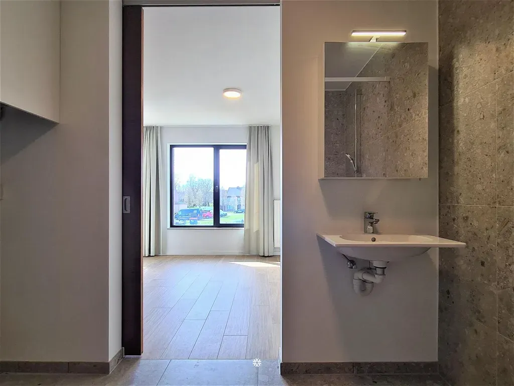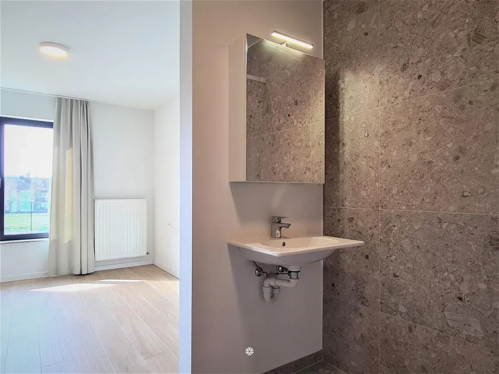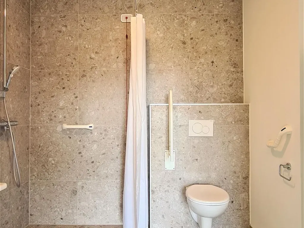 één slaapkamer met ingebouwde kledingkast, ingerichte badkamer (toilet, lavabo, inloopdouche), terras.