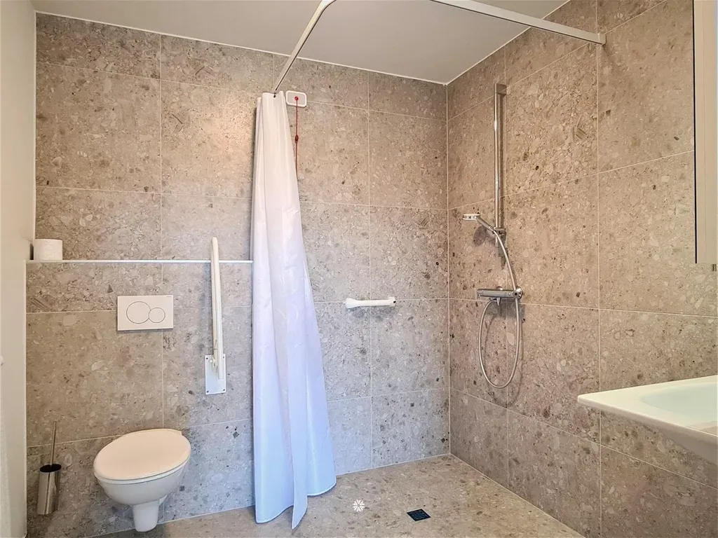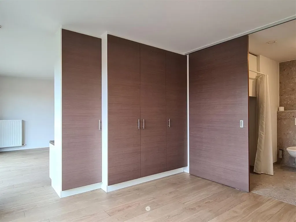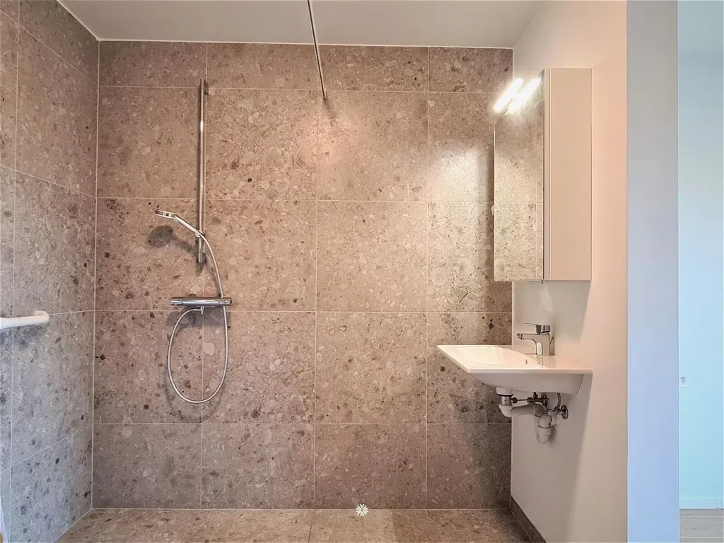 één slaapkamer met ingebouwde kledingkast, ingerichte badkamer (toilet, lavabo, inloopdouche), terras.