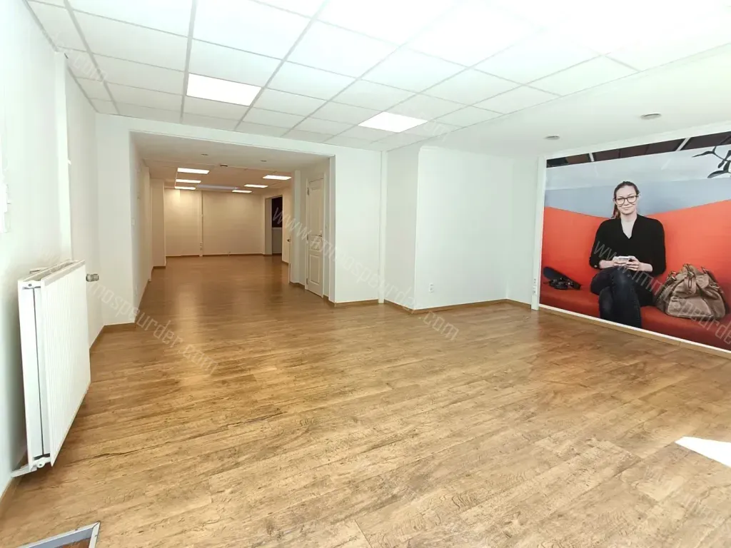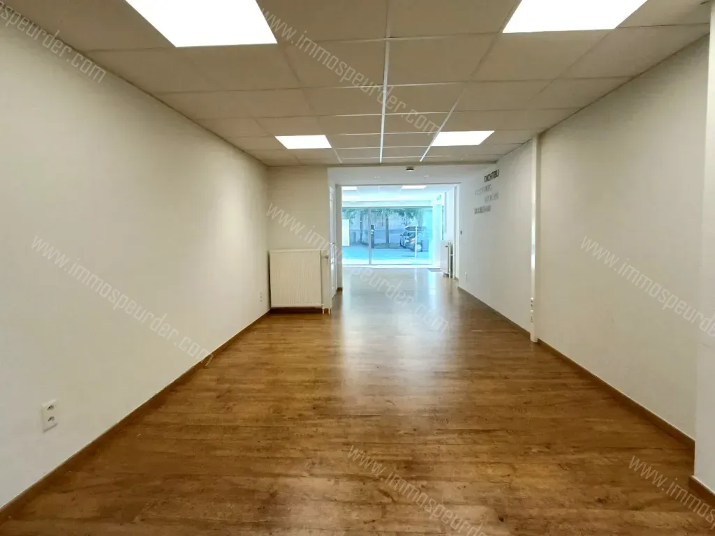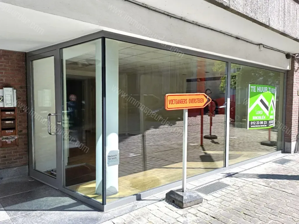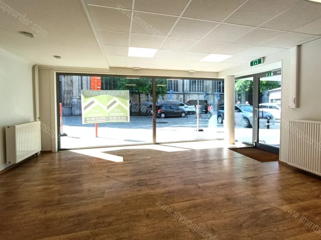 INDELING: Ruime winkel- of kantoorruimte met grote ramen vooraan. Achteraan links een aparte ruimte, rechts een keukentje. Verder 2 aparte toiletten.