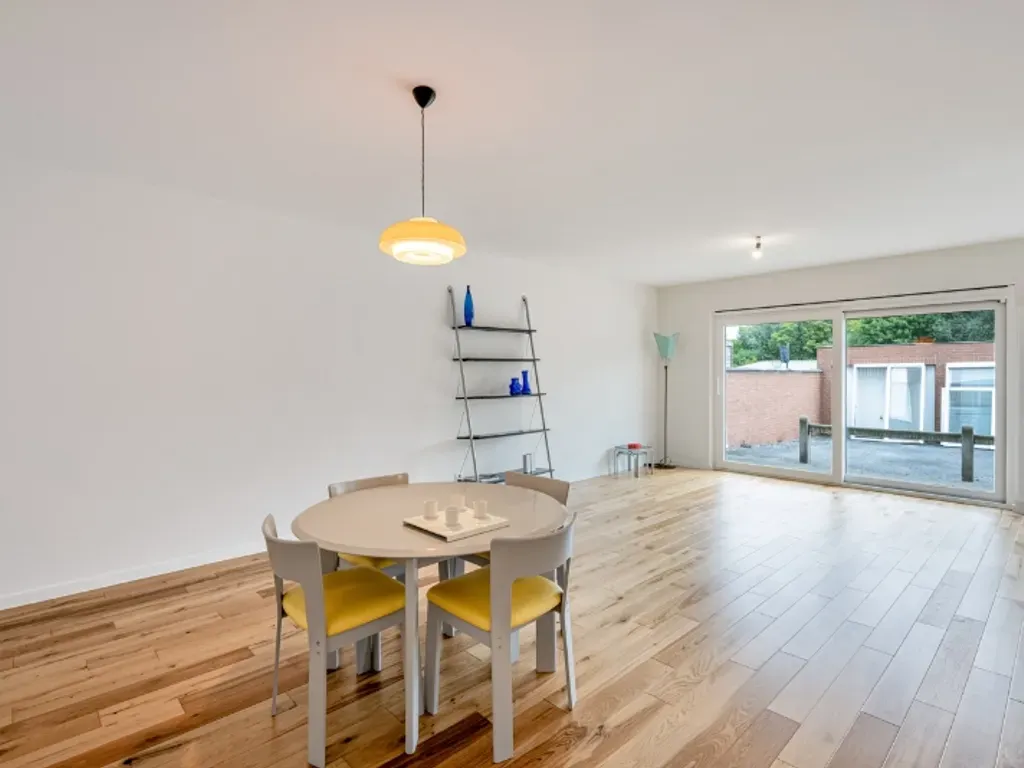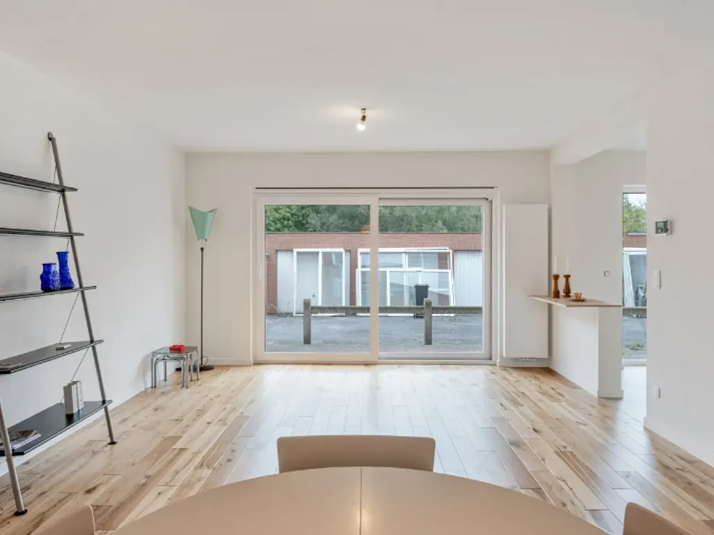 Ninovesteenweg 77 bus 3(1.1) - 9300 Aalst - Stadsrand, Haring, volledig vernieuwd instapklaar appartement in klein gebouw (6 appartementen) aan invalsweg en dicht bij het centrum, nabij supermarkt en restaurant.Hall, ruime woonkamer + terras naar natuurgebied gericht, met open ingerichte keuken: koelkast, diepvriezer, kookplaat, dampkap, 2 ovens, vaatwasser; aansluitend wasplaats/berging.Grote en kleinere slaapkamer, apart toilet, badkamer met instapdouche en badmeubel. Alles afgewerkt met kwaliteitsmaterialen. Volledig professioneel geschilderd.Individuele tellers voor de nutsvoorzieningen. 12.8 m² zonnepanelen per appartement. CV aardgas. Energielabel A. Bewoonbaar : 100 m².Optioneel aan te kopen: individuele garagebox (25.000) en/of autostaanplaats (10.000).
