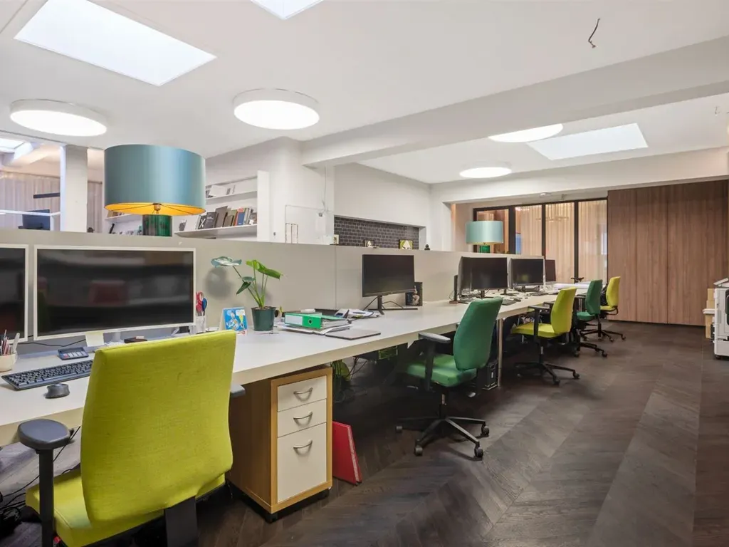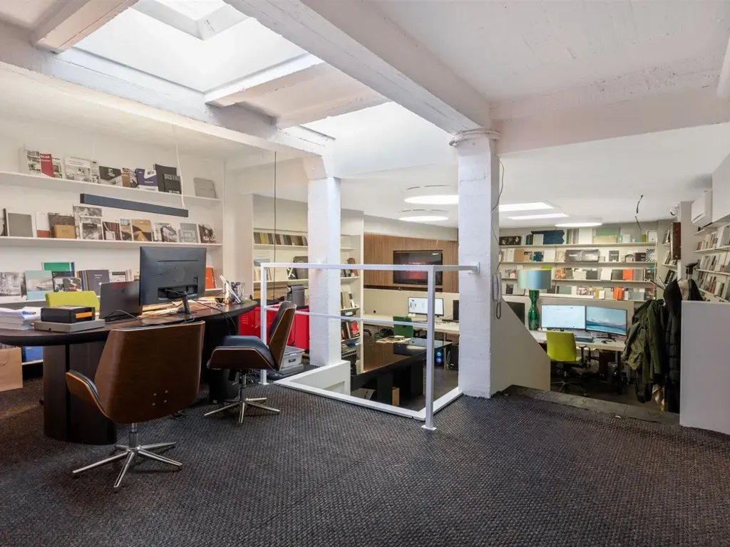 De ruimte ademt een loftachtige sfeer, met hoge plafonds, zichtbare structuren en een overvloed aan daglicht dankzij lichtkoepels en grote open volumes.• Voormalig interieur- en ontwerpkantoor
