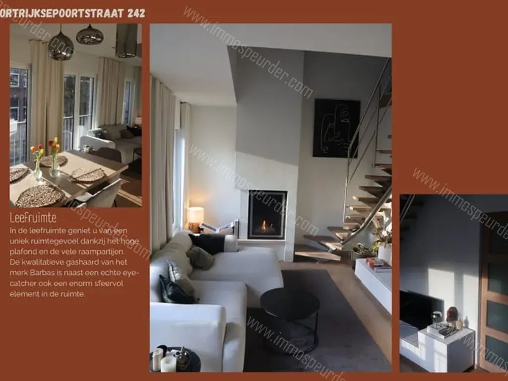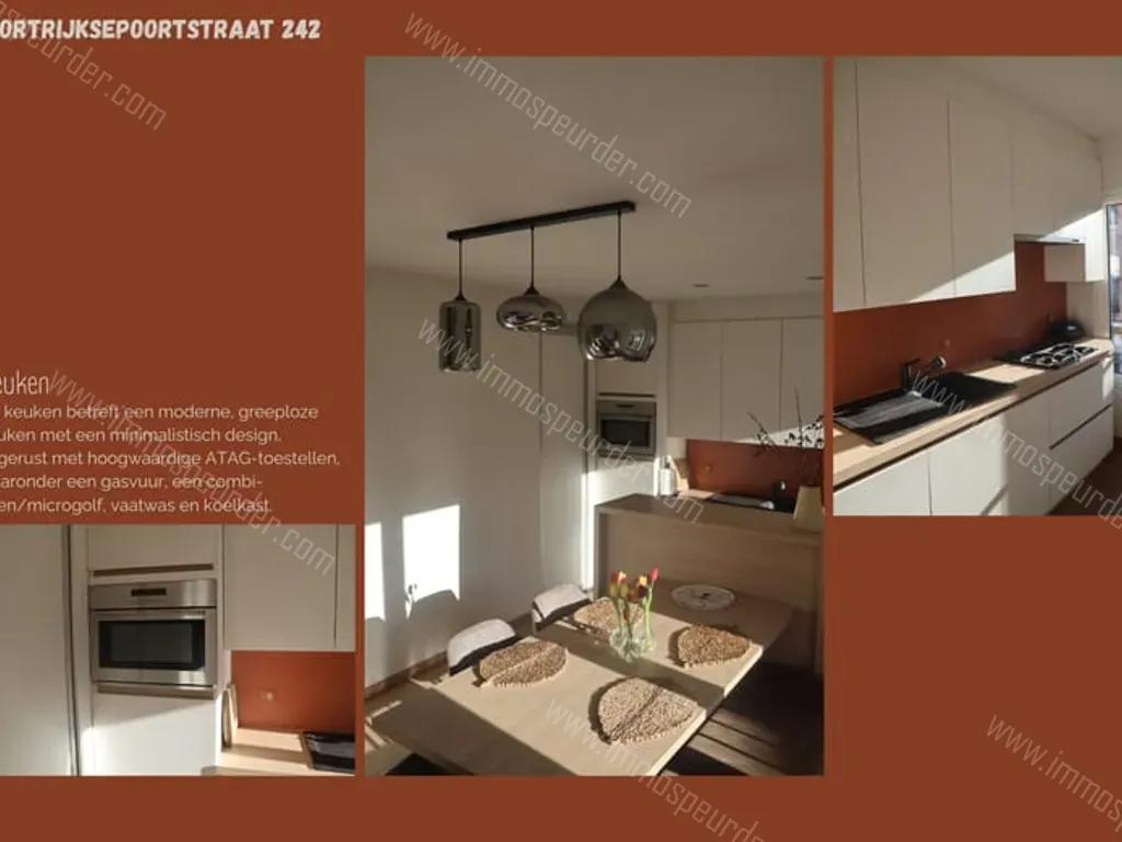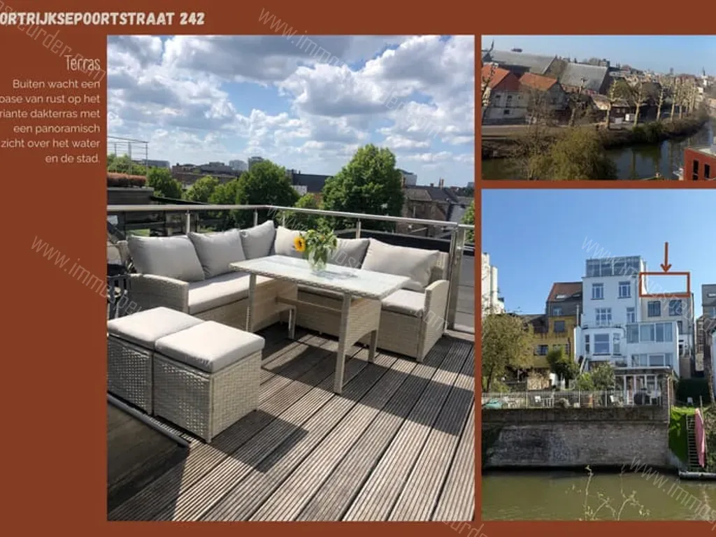 Kortrijksepoortstraat 242 - 9000 Gent - Dit instapklare appartement combineert moderne architectuur met rust, overvloedig licht en een spectaculair uitzicht over de stad en het water. Bij het binnenstappen van de inkomhal ervaart u direct de rust door de combinatie van lichtrijke kleuren en de warme parketvloer die in het volledige appartement is doorgetrokken. De leefruimte is een absolute eyecatcher door de gashaard en het unieke ruimtegevoel dankzij het hoge plafond. De moderne, greeploze keuken is voorzien van hoogwaardige ATAG-toestellen, waaronder een gasvuur, combi-oven/microgolf, vaatwas en koelkast. Het appartement beschikt over twee slaapkamers. De eerste slaapkamer is een serene ruimte met een uitgebreide wand aan op maat gemaakte inbouwkasten. De tweede slaapkamer (mezzanine) op de bovenverdieping biedt een veelzijdige ruimte met een ingebouwd bureau, en beschikt over airconditioning voor een optimaal klimaat het hele jaar door. De tijdloze badkamer is afgewerkt met een breed lavabomeubel, douche, handdoekradiator en een onderhoudsvriendelijk hangtoilet. Praktisch gemak is voorzien door de aparte wasruimte en een gedeelde (fietsen)berging met een aparte ingang. Buiten wacht een oase van rust op het riante dakterras met een panoramisch zicht.
