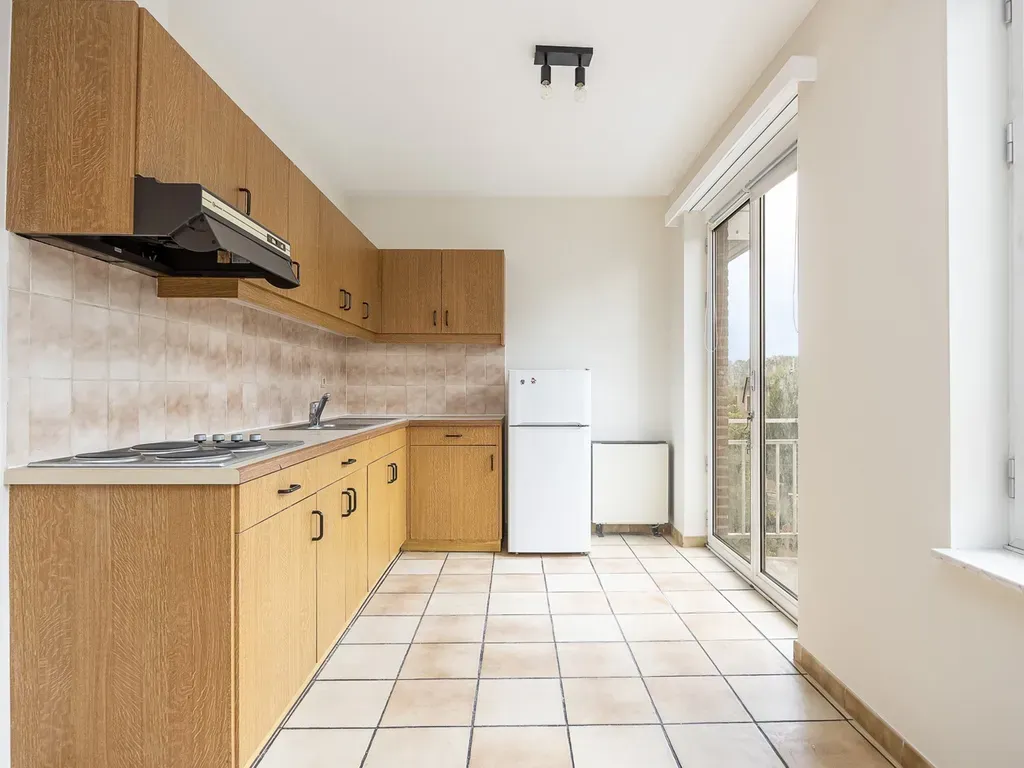 Open ingerichte keuken +/- 8.5 m², met kasten, kookfornuis, dampkap, frigo met vriesvak, dubbele spoeltafel, balkon +/- 1 m².