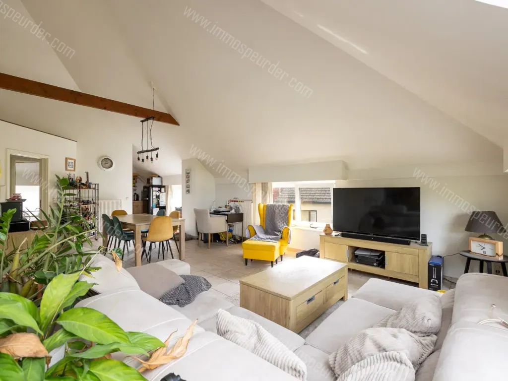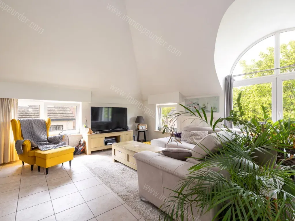 De grote leefruimte heeft zeer veel natuurlijke lichtinval met vooraan een terras, met uitzicht op de kerk en het prachtige kasteeldomein. Aangrenzend aan de leefruimte heeft men de keuken. Verder ook nog een gastentoilet, wasplaats en badkamer met ligbad (met douchemogelijkheid) en dubbele lavabo.