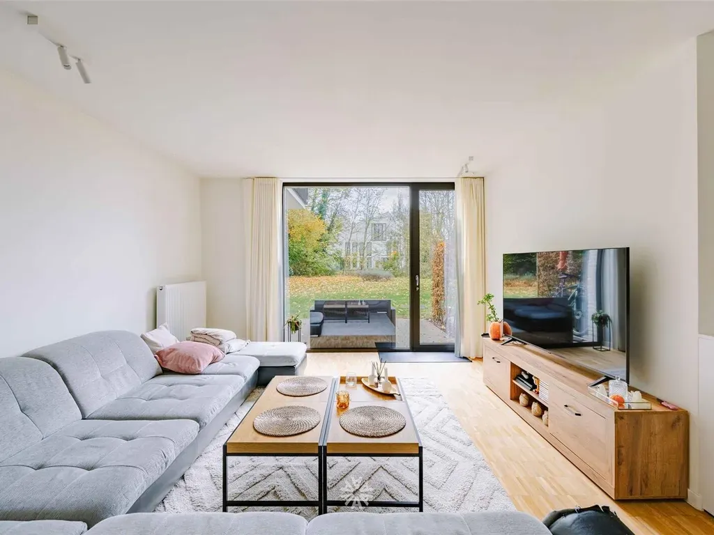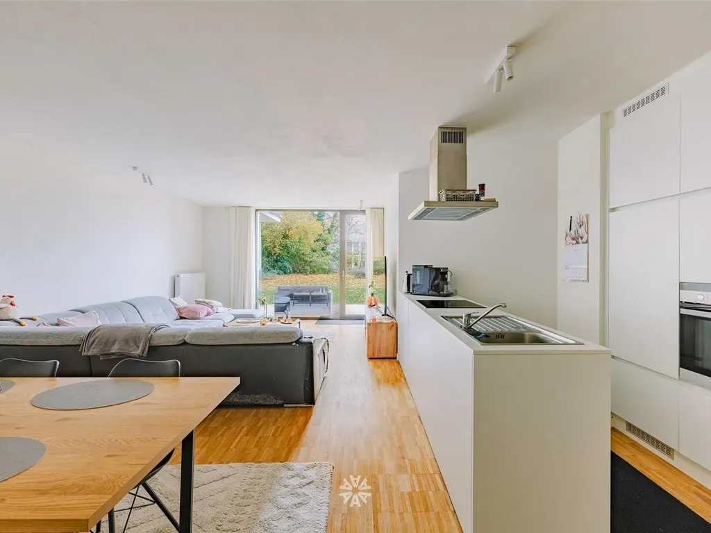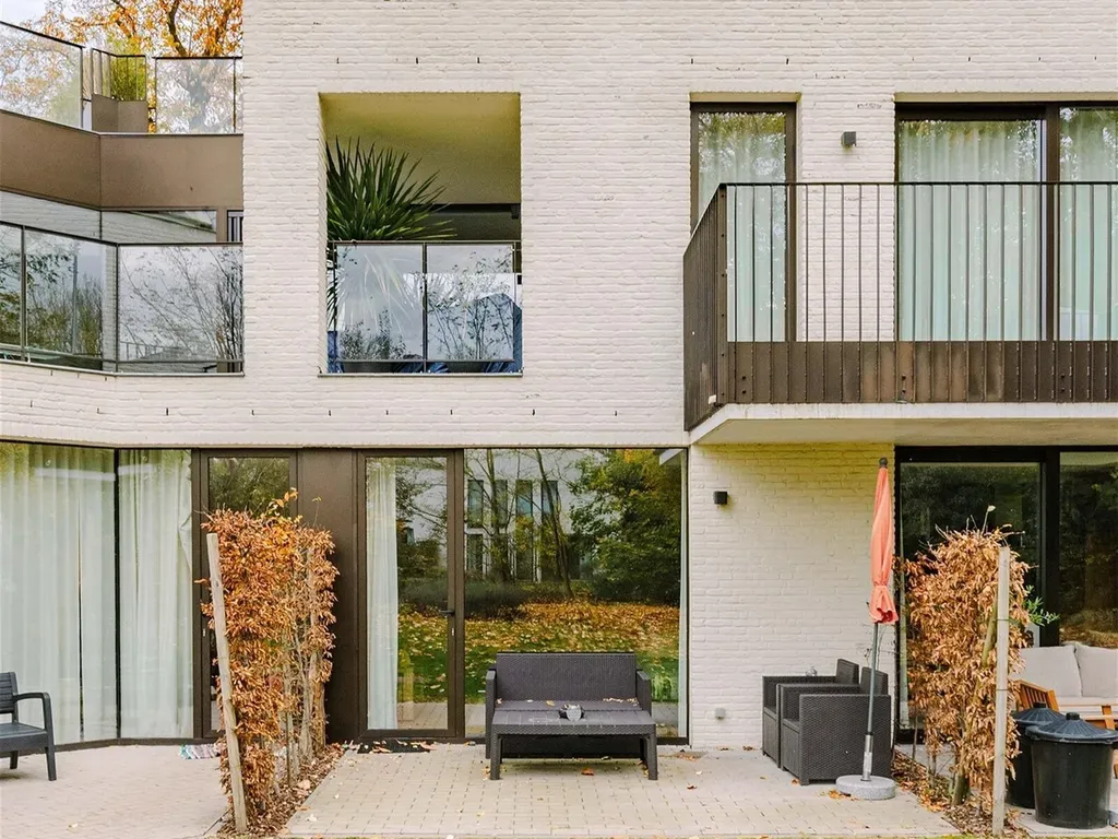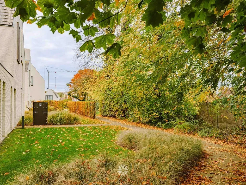De leefruimte geeft uit op een gezellig terras met aansluiting tot de gemeenschappelijke groene tuin. Het appartement beschikt langs beide zeiden over een gedeelte individueel groen.
