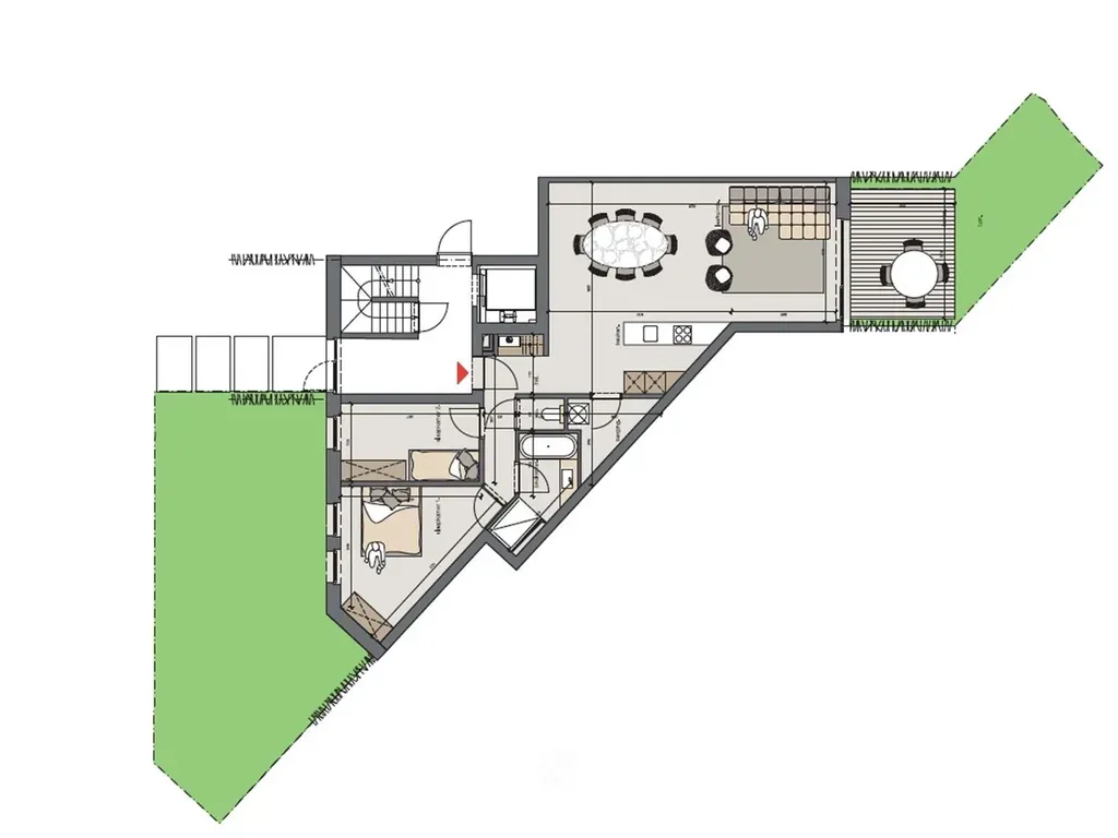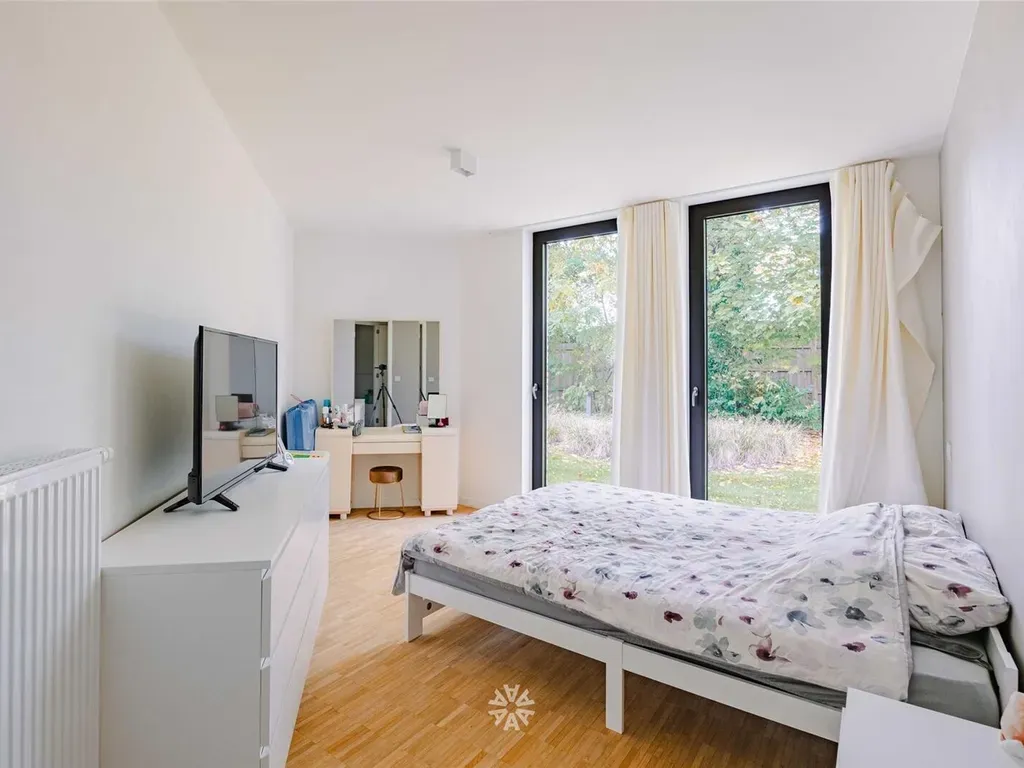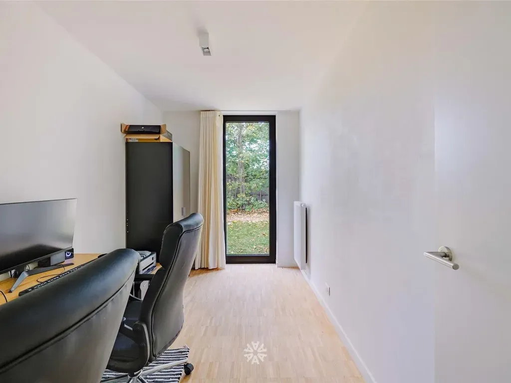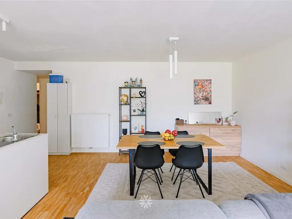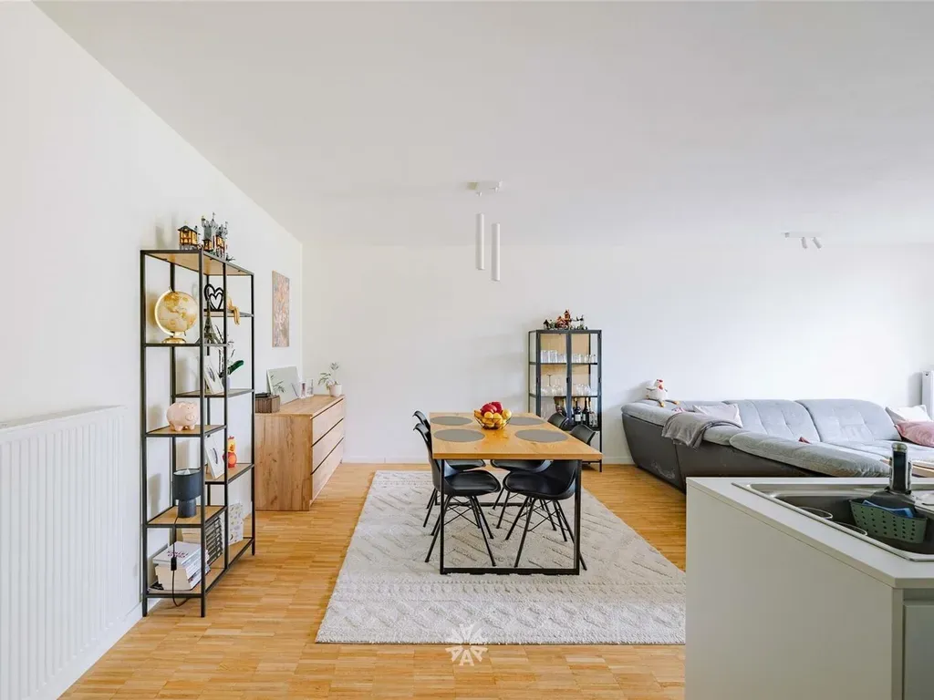 De leefruimte geeft uit op een gezellig terras met aansluiting tot de gemeenschappelijke groene tuin. Het appartement beschikt langs beide zeiden over een gedeelte individueel groen.