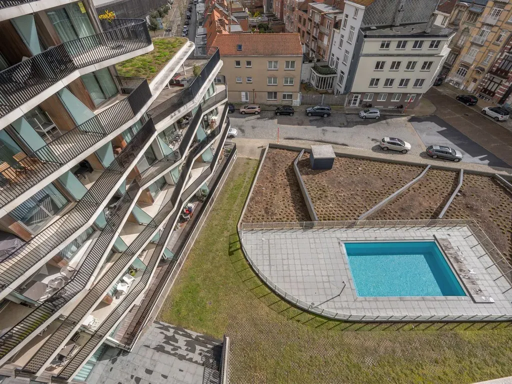 De lichtrijke woonkamer met toegang tot het terras, de open keuken met kwaliteitsvolle Miele toestellen, gastentoilet, badkamer met douche, toilet en wastafel, één slaapkamer met toegang tot het terras en is er nog een mogelijkheid om de wasruimte om te bouwen tot dressing. Als extra troef beschikt dit appartement over een gemeenschappelijk zwembad.