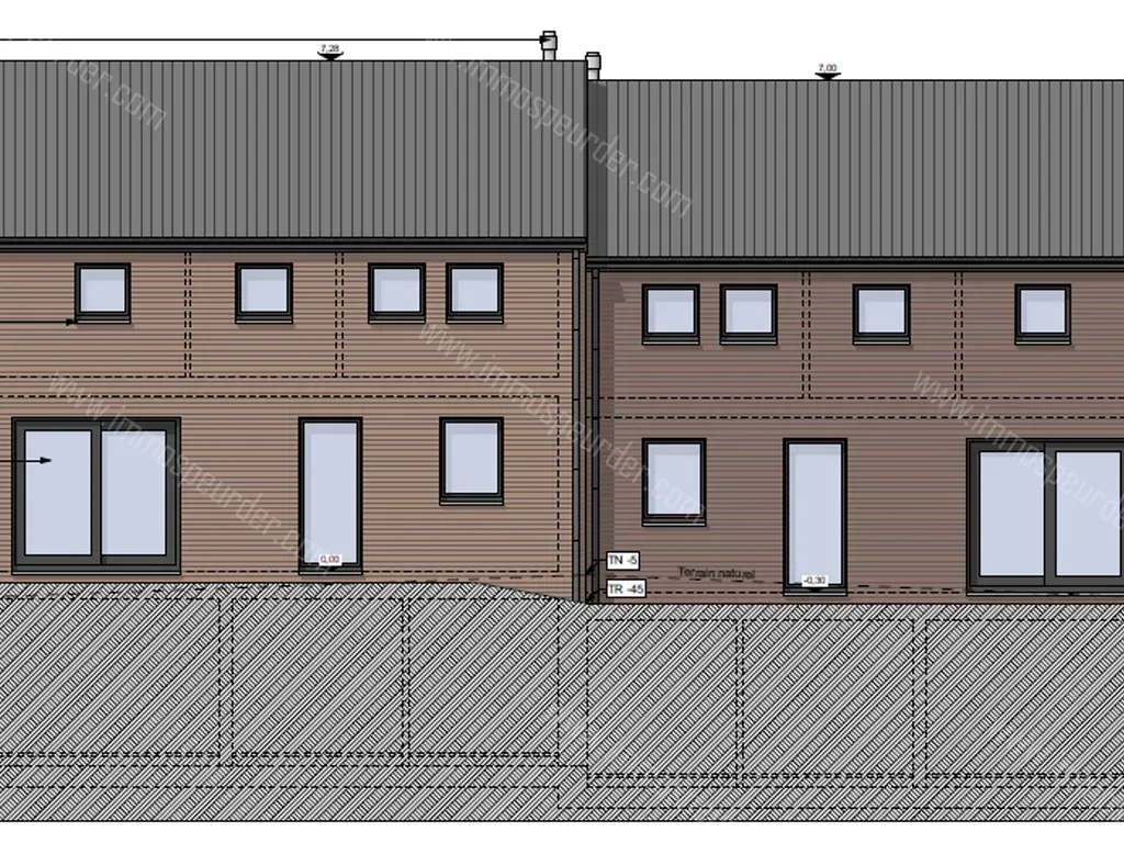 Maison 4 chambres, salles de bains, buanderie, terrasse, jardin, garage et cave pour une superficie de +/- 130m² habitable. Composition identique pour les deux maisons.
