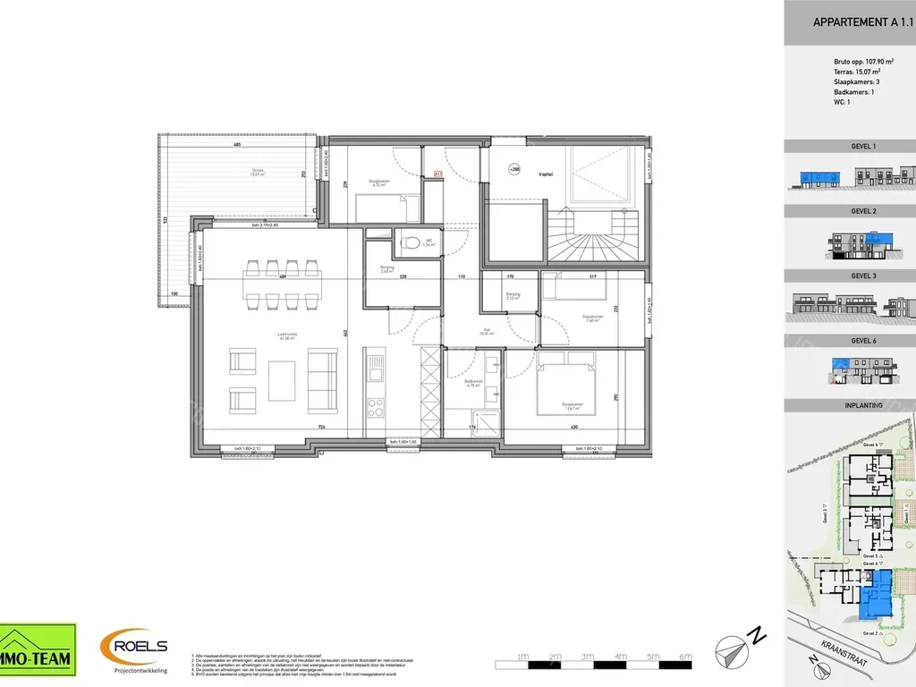 Dit appartement bevindt zich op de eerste verdieping in gebouw A van het project. Het appartement omvat een ruime inkomhal die toegang geeft tot de eet- en leefruimte met open keuken. Aansluitend aan de keuken is er een bergruimte voorzien. Via het grote schuifraam in de living bereikt men het aangename terras van 15 m². Verder omvat het appartement drie ruime slaapkamers, een extra bergruimte, badkamer en een apart toilet. In de kelderverdieping kan er een autostaanplaats en berging bij aangekocht worden.