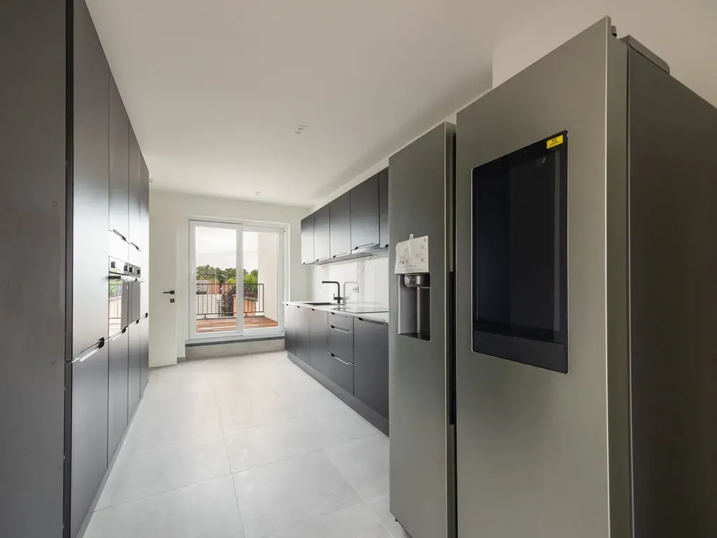 Via de gemeenschappelijke inkomhal, betreed je de inkomhal van het appartement. De leefruimte (+/- 37 m²) op parket geniet van een mooie lichtinval door de grote ramen en het open zicht. Open ingerichte keuken (+/- 16,86 m²) voorzien van kasten, kookfornuis, Amerikaanse frigo, dampkap, spoeltafel, oven en vaatwasser. Berging. De keuken geeft rechtstreeks uit op het terras voorzien van bankirai (+/- 10,12 m²). Slaapkamer op parket (+/- 14,52 m²) met een ensuite badkamer voorzien van wastafel met meubel, inloopdouche.