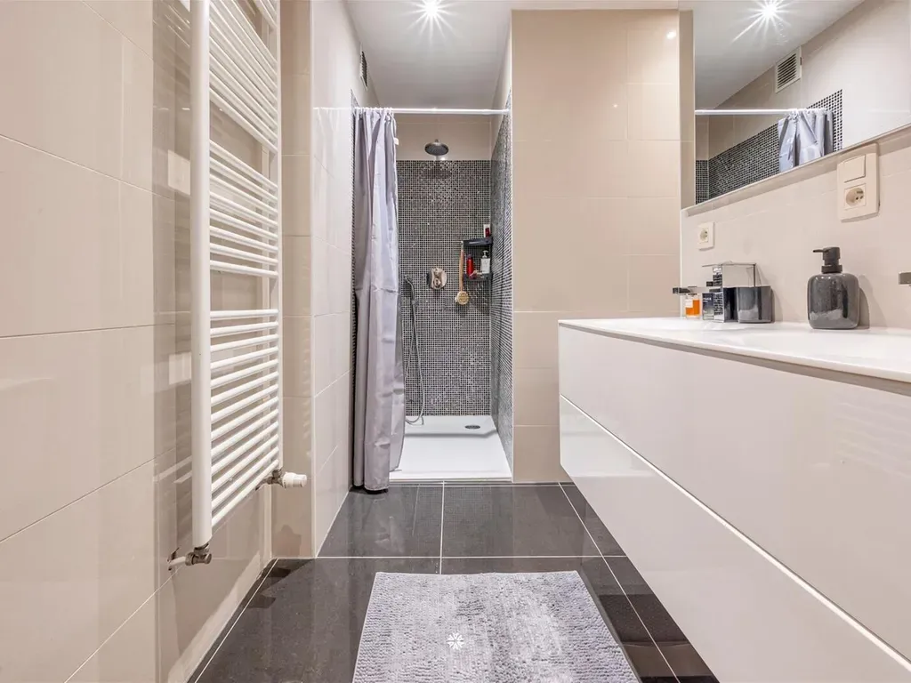 De nachthal leidt naar de moderne badkamer, uitgerust met een dubbele lavabo, een ruime inloopdouche en aansluiting voor de wasmachine. Verder is er een afzonderlijk toilet en twee volwaardige slaapkamers in parket, waarvan één toegang heeft tot het terras.