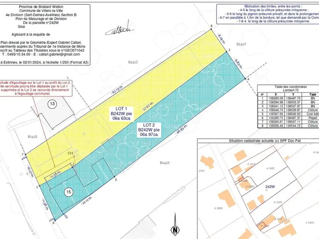 Rue du Vieux Chemin 15 - 1495 Sart-Dames-Avelines - FAIRE OFFRE A PARTIR DE 117.500€ (ss réserve d'acceptation par le propriétaire) ! SART-DAMES-AVELINES, ds ce super chouette village de la commune de Villers-la-Ville, au calme, au vert, mais à deux pas des axes qui vous sont chers, vers Namur/Nivelles, N5 vers Charleroi/Waterloo, à 20' de Louvain-la-Neuve, à 2 pas des commerces de proximité, Intermarché, ferme bio, etc... cette parcelle de terrain (lot 2 JAUNE au plan du géomètre) vous attend avec votre plus beau projet d'une villa 4 façades sous réserve d'obtention de votre permis d'urbanisme par vos soins. La parcelle NORD-EST propose une superficie de +/- 6a63ca. Largeur de façade : 10,27Mètres. Profondeur gauche : 67,13 Mètres - Profondeur droite : 57,67Mètres - Largeur en fonds de parcelle : 8,19Mètres. Frais de bornage et de mesurage à charge de l'acquéreur. Les frais de redevance éventuels des sociétés de distribution d'eau et d'électricité qui pourraient être réclamés à la suite de la division du bien seront aussi à charge de l'acquéreur. Descriptif complet et plus de photos uniquement sur www.valdelimmo.be