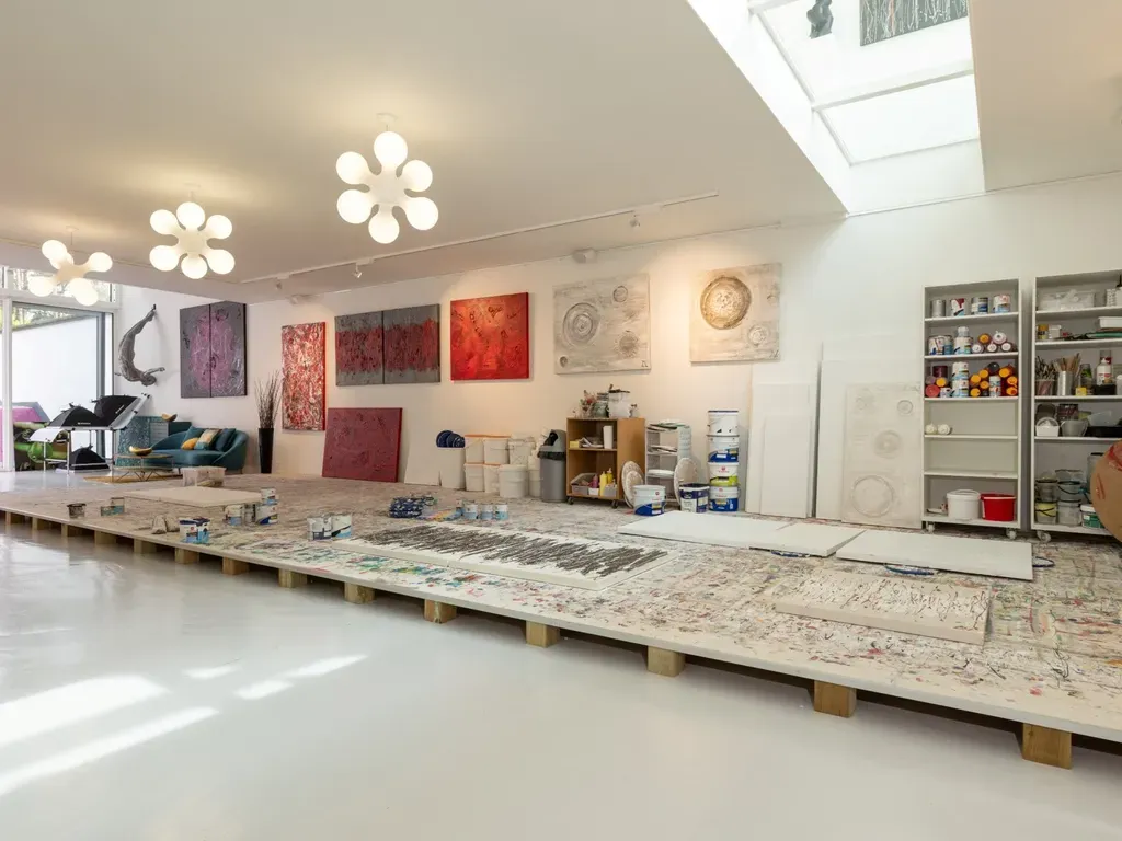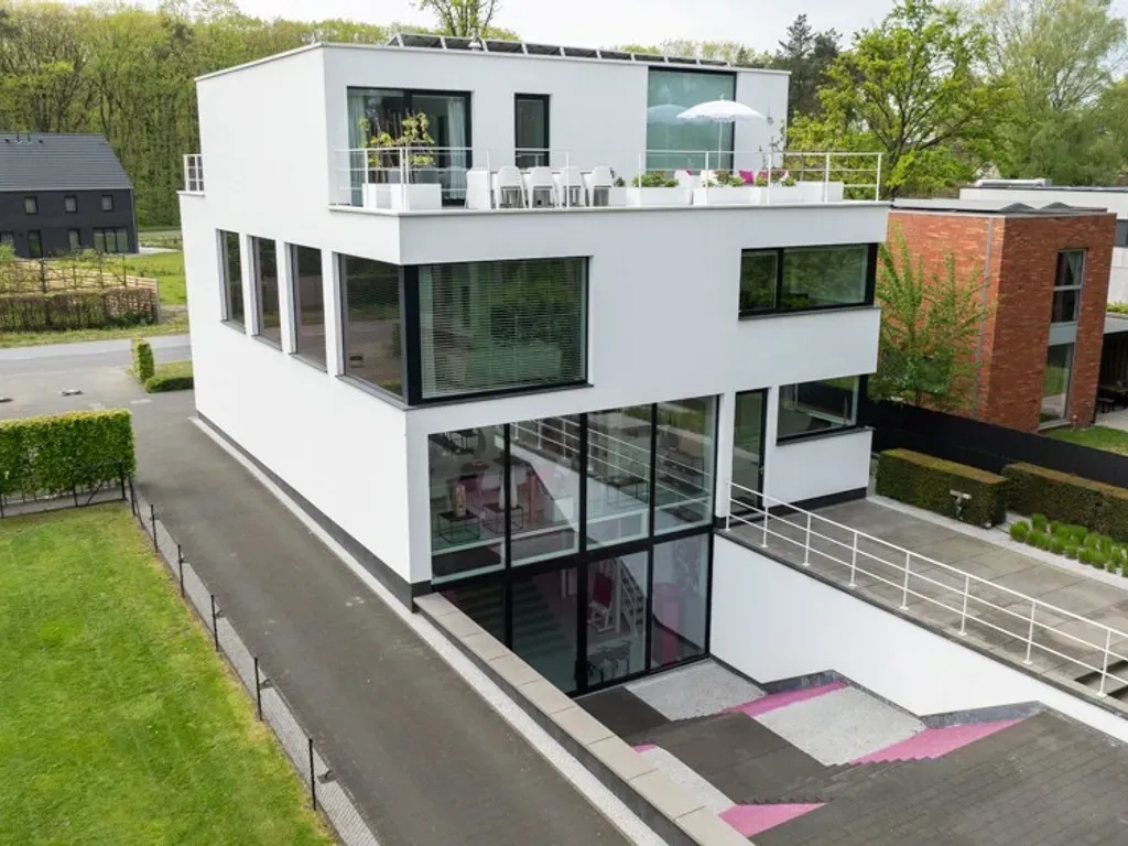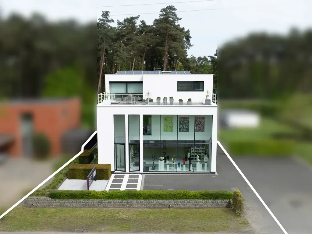 Aan een invalsweg, niet zo ver gelegen van de autostrade E313 vinden we dit knappe, strakke, polyvalente gebouw met meerdere mogelijkheden, momenteel wordt het gelijkvloers en de sous-sol gebruikt als atelier en expositieruimte (391m²) en de 1e en 2e verdieping als woning met kantoren (309m²).