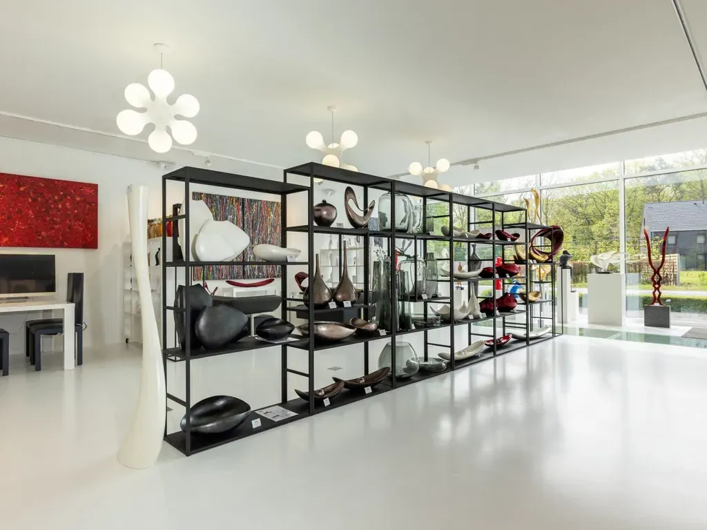 De imposante glazen voorgevel met hierin de toegangsdeur, brengt ons tot de indrukwekkende expositieruimte met hoog plafond (3m), epoxy gietvloer, 2 sanitaire ruimtes, apart kantoor en aan de achterkant tevens een volledig ingerichte keuken, volledig afgewerkt met plafondhoge maatkasten en een toegangsdeur naar de parking/terras achteraan.