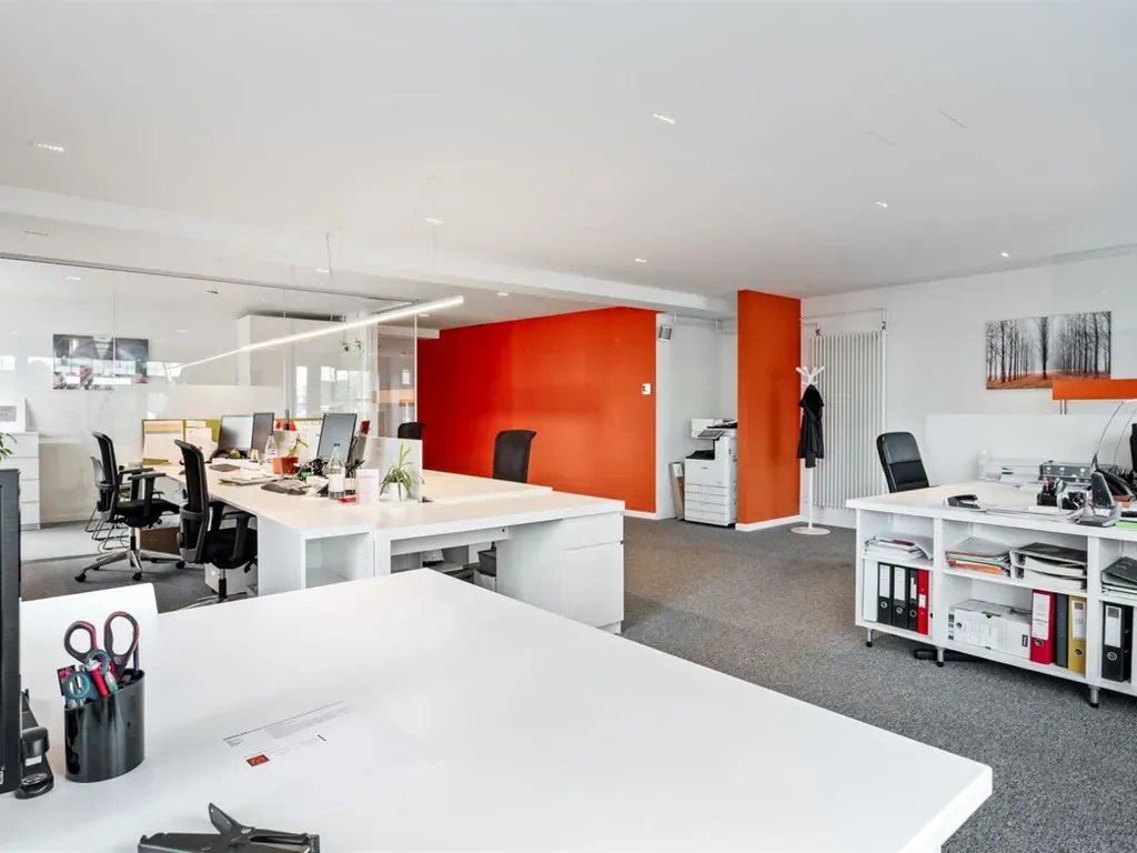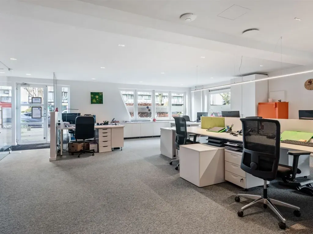 Indeling: inkom, verzorgde open kantoorruimte met verschillende bureau's + apart kantoor achter glas, technische ruimte met ventilatie-unit en server, verzorgde kitchenette, gescheiden sanitair (M/V), moderne vergaderruimte.