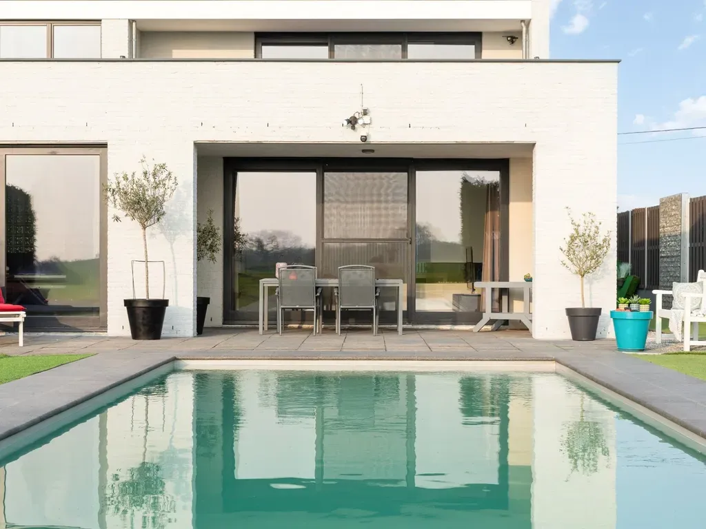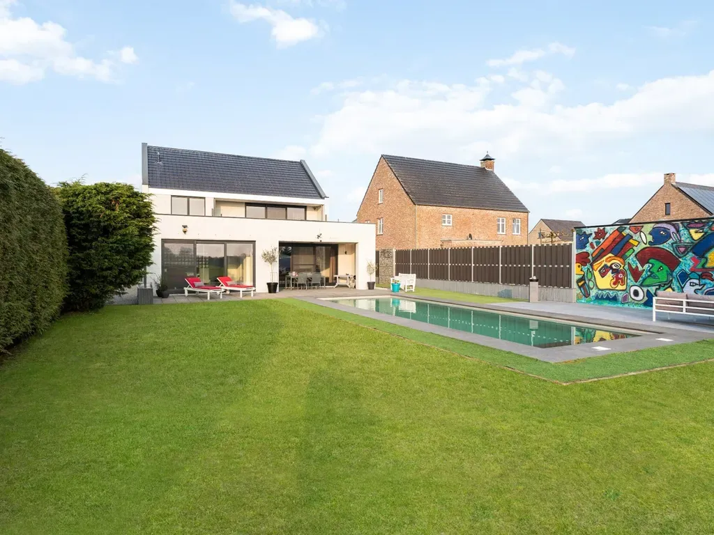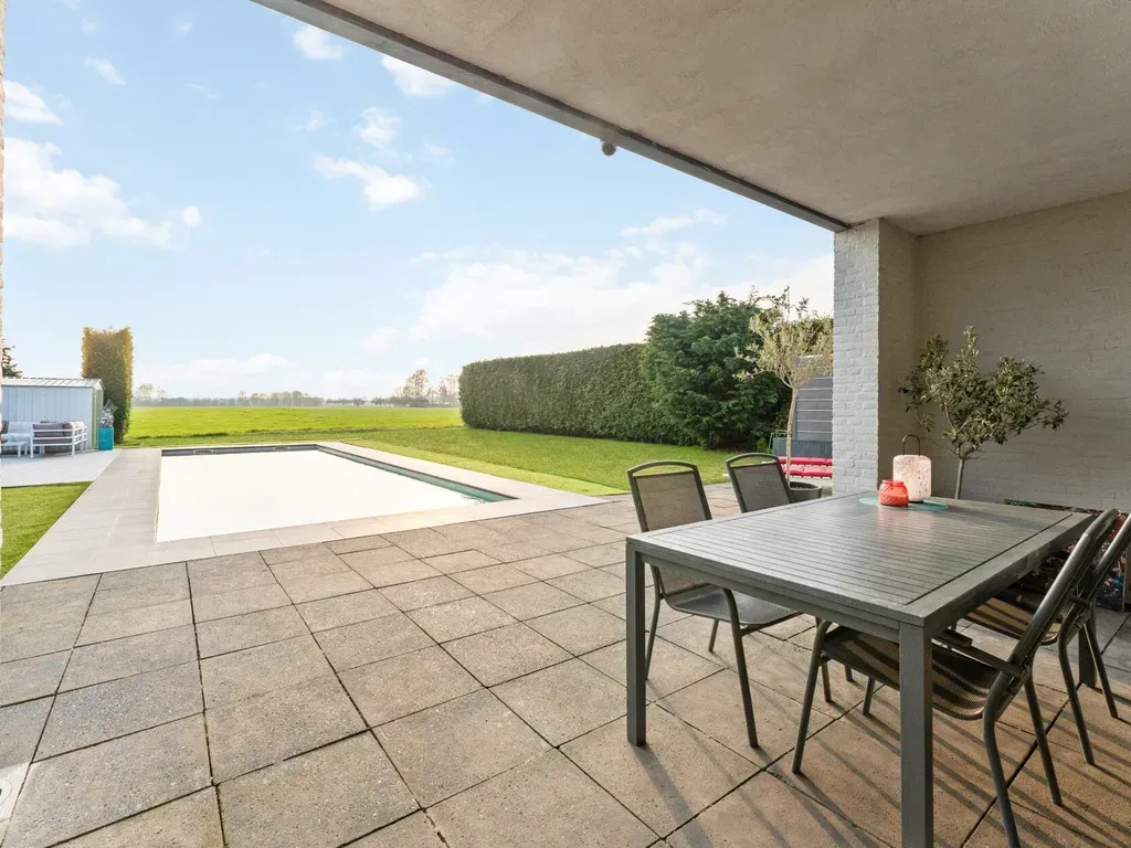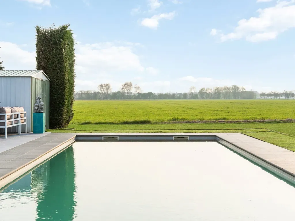 De zuid gerichte tuin biedt een hoge mate van privacy en vormt een ideale omgeving voor wie graag van het buitenleven geniet. Het verwarmde buitenzwembad, uitgerust met een afdekrolluik en zonnecollectoren, biedt een prachtig uitzicht op de achterliggende grasvelden en creëert een bijzonder rustige en aangename sfeer.