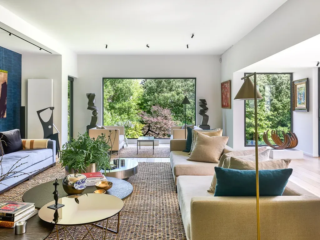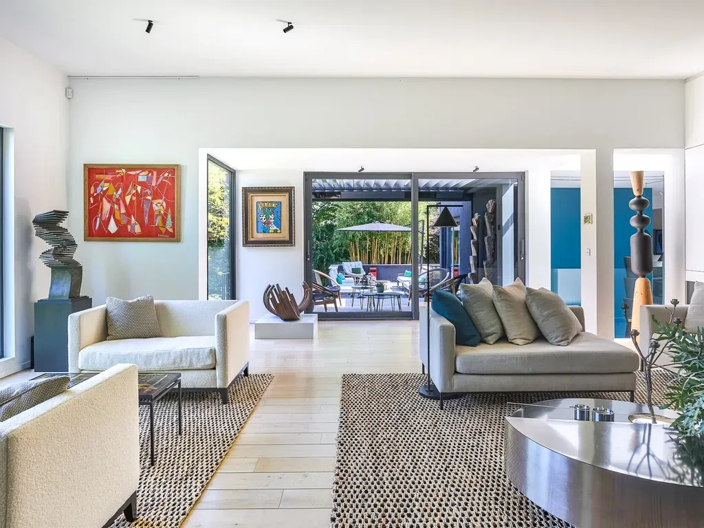 De inkomhal geeft toegang tot een vestiaire met gastentoilet, een TV-salon, een bibliotheeksalon, en een ruime woonkamer met open haard. De aangrenzende eetkamer opent naar een breed terras uitgerust met een verwarmde pergola. De gezellige keuken, met kookeiland en ontbijthoek, is volledig uitgerust. Op tuinniveau: een oudersuite met airconditioning, dressing en badkamer, drie slaapkamers waarvan één met aangrenzende doucheruimte, een onafhankelijke doucheruimte, een bureau, evenals een wellness-ruimte bestaande uit een binnenzwembad van 12 m, hammam en directe toegang tot de tuin.