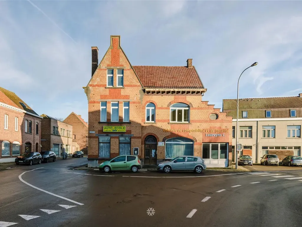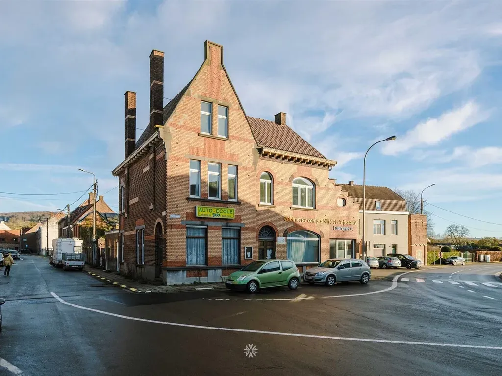Dit pand met haar uniek façade werd gebouwd tussen 1919 en 1930 en ligt in de dorpskern van Amougies, vlakbij wandel- en fietspaden en het Kluisbos. Het heeft actueel twee huisnummers en het is opgebouwd als twee apart te betrekken woningen. De woning met adres Place d'Amougies bestaat uit een riante inkom en een zeer ruime leefruimte. Op het het gelijkvloers vinden we verder nog twee leefruimtes, een keuken en een badkamer met de toegang naar de ommuurde tuin. Op de verdieping twee grote slaapkamers en één kleinere. Verder een zeer grote zolder met potentieel tot extra kamers. De woning op het adres rue des Croissons bestaat uit een ruime leefruimte, een eetplaats en een keuken op het gelijkvloers. Op de verdieping twee slaapkamers en eveneens een zeer ruime zolder. Beide woningen beschikken over een kelder. In de ommuurde tuin staat er een atelier. Het pand is uitermate geschikt als grote gezinswoning, als combi gezinswoning met vrij beroep en heeft ook potentieel als meergezinswoning.