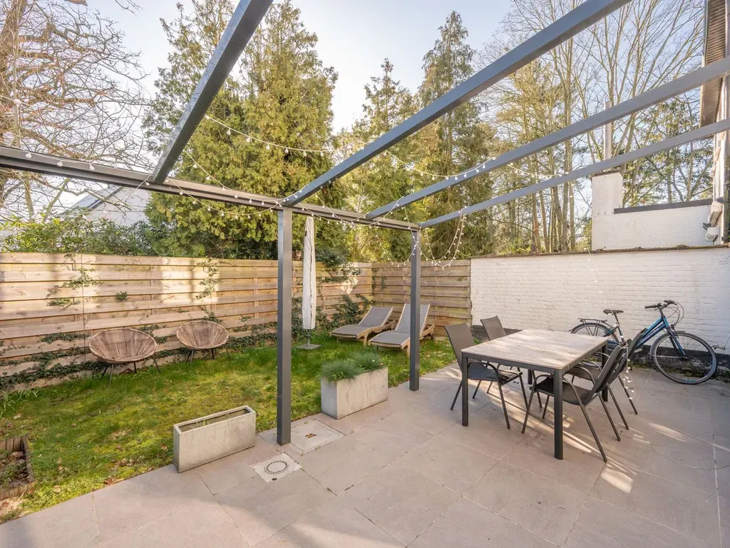 Indeling als volgt: Op het gelijkvloers treft men de inkomhal, woonkamer met eetplaats, uitgeruste open keuken, de gezellige stadstuin met terras, garage en toilet. Op het eerste verdiep vindt men 3 volwaardige slaapkamers, een badkamer met ligbad met douchefunctie, toilet en badkamermeubel. Verder beschikt de woning nog over een polyvalente zolderruimte met een tal van mogelijkheden en 2 buitenparkeerplaatsen (1 voor de garagepoort en 1 op de locatie aangeduid op de afbeelding).