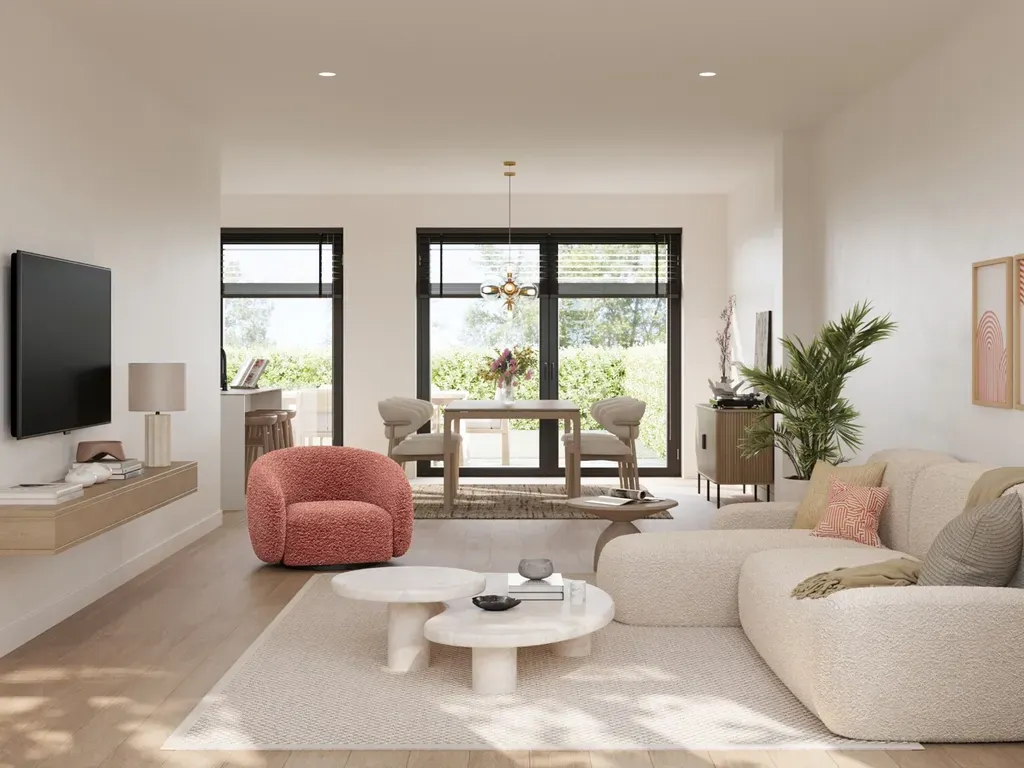 De inkomhal met gastentoilet verleent toegang de gezellige leefruimte op parket met open keuken. De keuken is compleet ingericht met alle moderne apparatuur (combi-oven, koelkast, dampkap, vaatwas, inductiekookplaat). De leefruimte heeft een mooi zicht op de tuin, dankzij grote glaspartijen. De wasplaats/bergruimte is voorzien van aansluitingen voor wasmachine en alle technische voorzieningen.