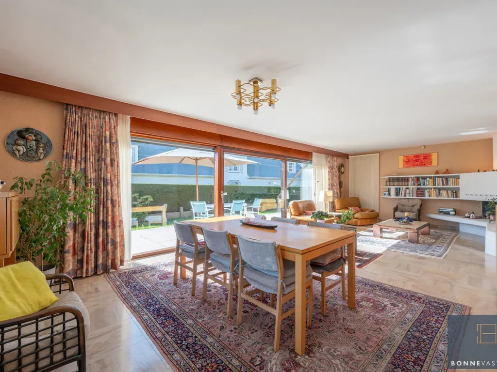 -Eerste verdieping: grote hoofdslaapkamer (desgewenst opdeelbaar in 2 kamers) met berging, tweede grote slaapkamer, apart toilet, grote badkamer (met ligbad, douche, bidet, dubbel lavabomeubel) en tot slot een kinderkamer die momenteel als berging dienst doet (offerte aanwezig om cv ketel in de garage te plaatsen).