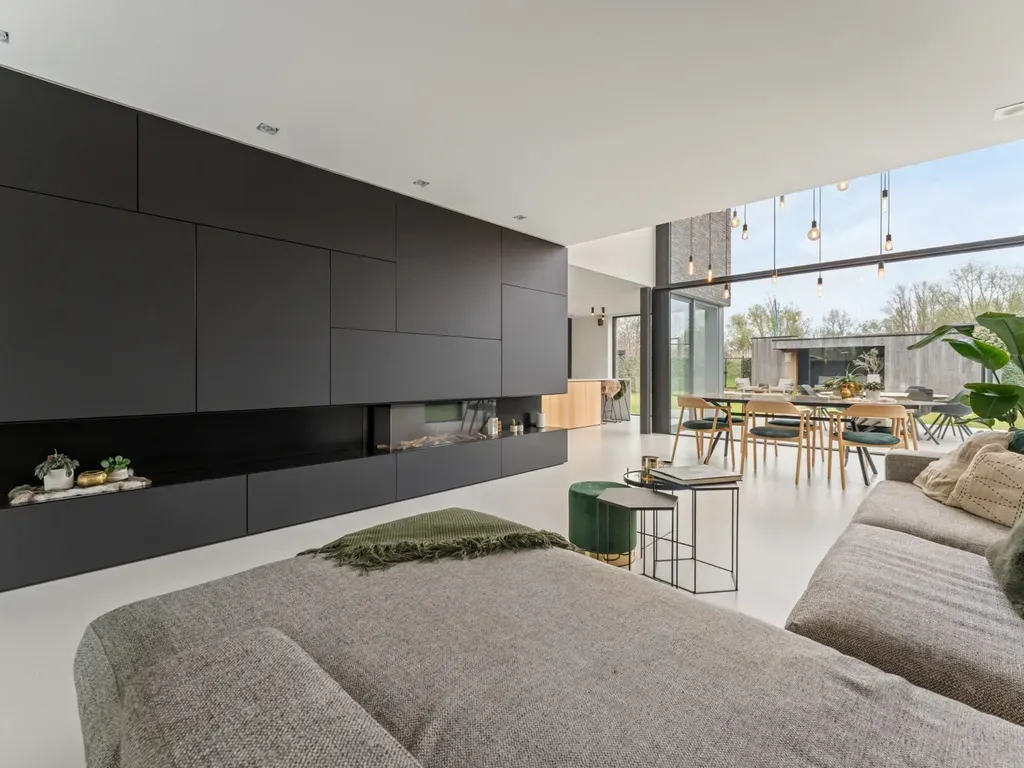 Aansluitend bevindt zich de lichtrijke zithoek, voorzien van een indrukwekkende vide, waar grote raampartijen zorgen voor een aangename connectie met buiten. Deze ruimte is bovendien zeer sfeervol afgewerkt door de op maat gemaakte tv kast met veel bergruimte en gezellige gashaard.