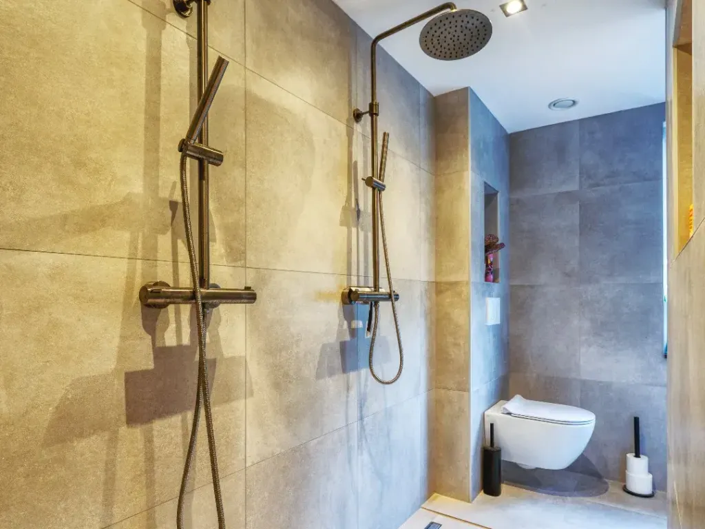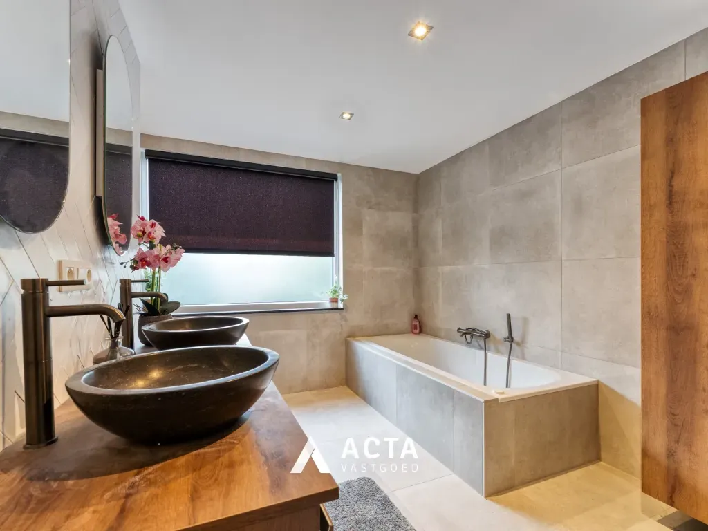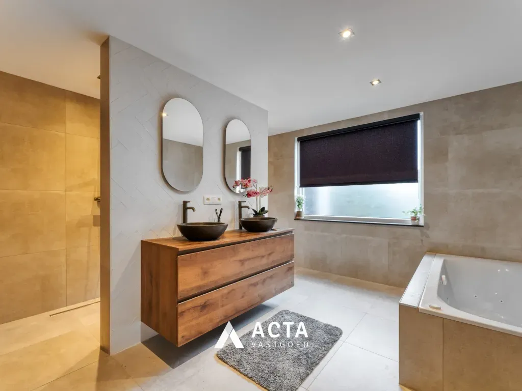 De luxueuze hoofdbadkamer is volledig betegeld tot aan het plafond en uitgerust met een ligbad, inloopdouche met dubbele sproeiers, dubbele lavabo met spiegel en onderkasten, en een toilet.