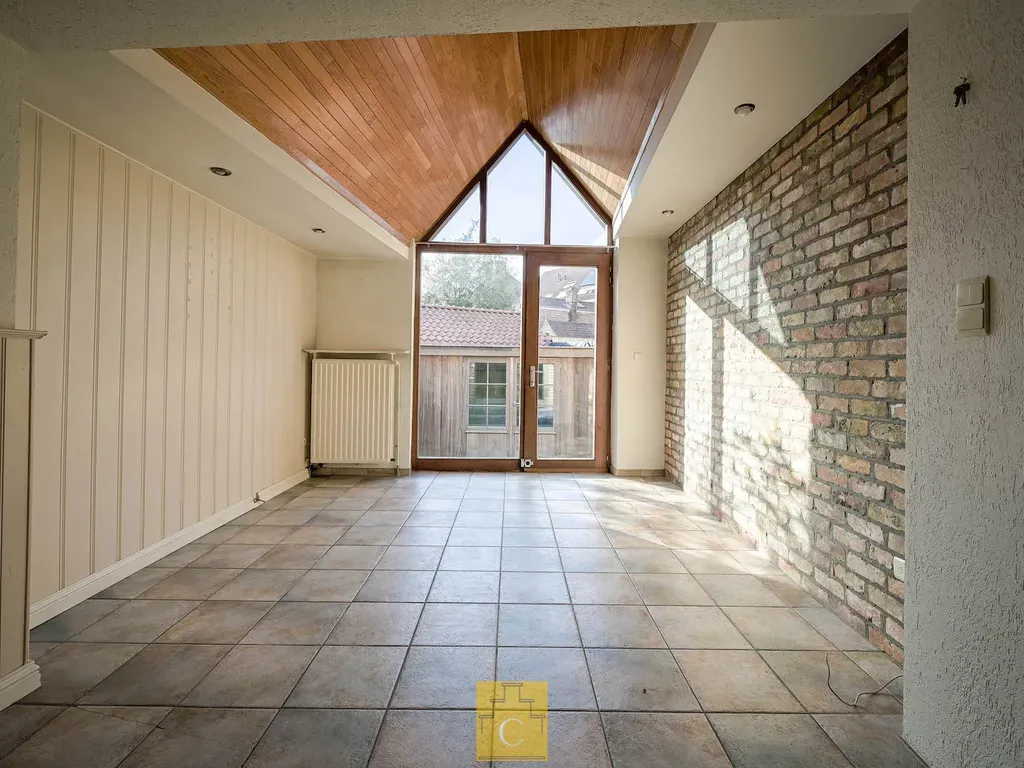 Gelijkvloers : inkom, toilet, volledig ingerichte open keuken met veel kasten en alle toestellen aan de straatzijde, mooie living (salon en eetgedeelte, lambrizering, inbouwverlichting uitbouw met grote glaspartij/schuifraam, open trap naar verdiep), zalig terrastuintje, grote berging achteraan.