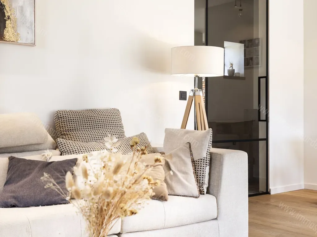 Op het gelijkvloers, via de inkomhal met gastentoilet, komt men in de gezellige leefruimte voorzien van gashaard en zithoek.