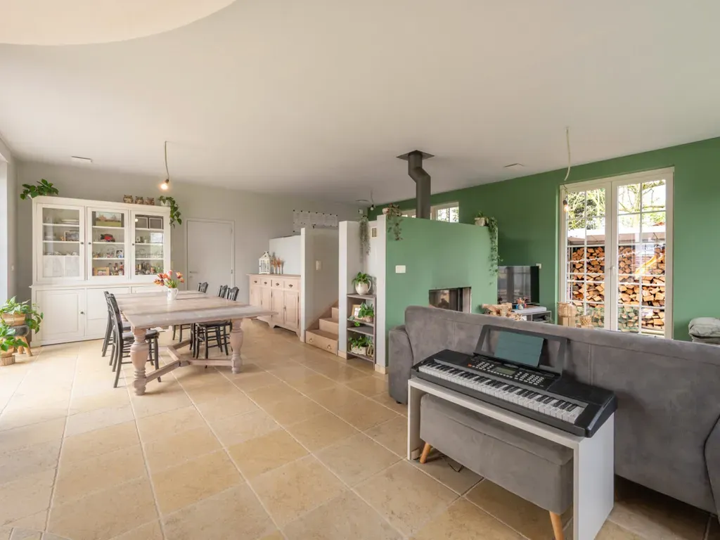 -Gelijkvloers: inkom met gastentoilet, lichtrijke en zongerichte leefruimte met zithoek (houthaard) en eetplaats, uitgeruste open keuken met eiland, toegang tot de kelder en bureau op de voute boven de kelder, berging, hal en dubbele garage met zolder boven.