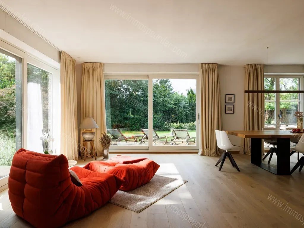 Bij het betreden van de woning valt meteen op hoe - dankzij de renovaties - het landelijke naadloos overgaat in het moderne. De elegante leefruimte fungeert als centrale verbindingsruimte naar alle hoeken van de woning. Aan de ene kant bevindt zich de bureauruimte die onrechtstreeks geconnecteerd staat met de leefruimte via de doorkijkhaard. Aan de andere kant is de leefruimte verbonden met de keuken. Tot slot bevindt zich achter de keuken nog een technische ruimte en een ruime dubbele garage. Zowel de living, keuken als de bureauruimte bieden toegang tot de tuin. Naast het aangenaam terras werd er aansluitend op de keuken ook een uiterst gezellige, overdekte zithoek gecreëerd. De keuken en aansluitende zithoek werden nog niet onder handen genomen.