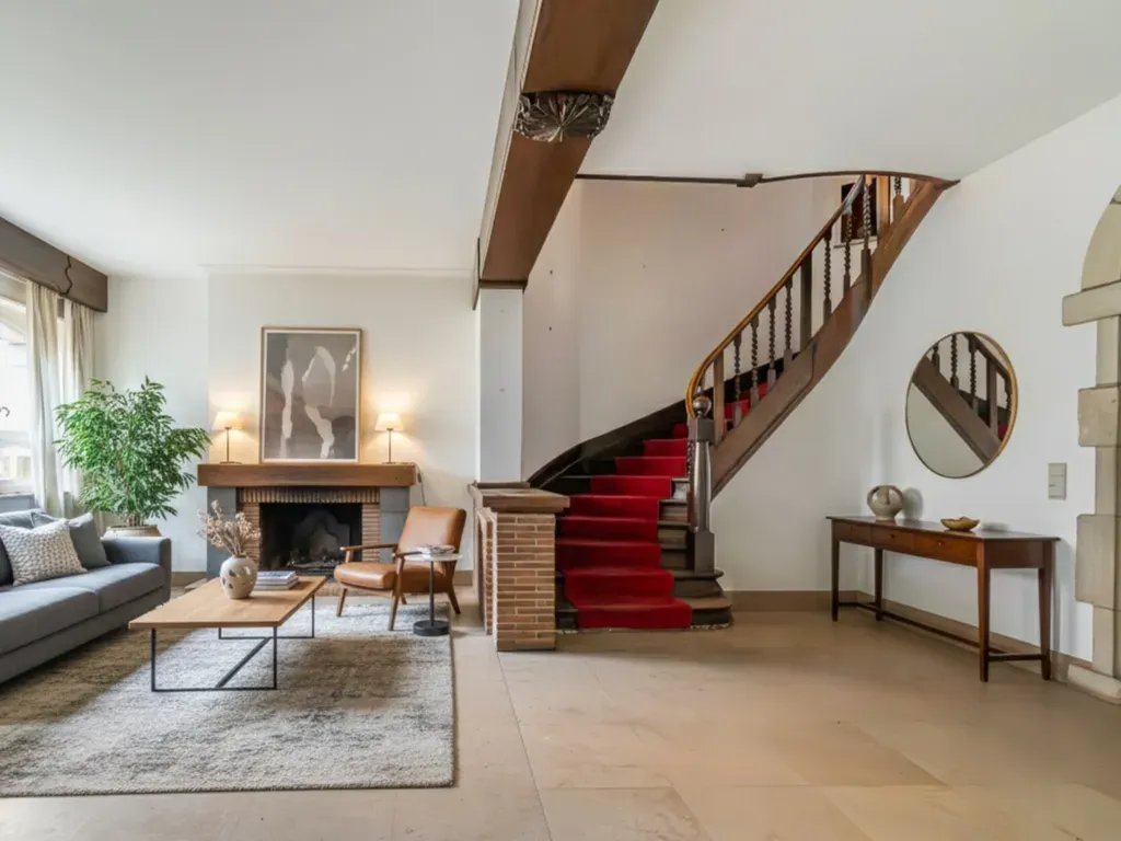 Op de eerste verdieping: centrale hal, hoofdwoonkamer met terras aan de tuinzijde, tweede salon met open haard en een dienstkamer.