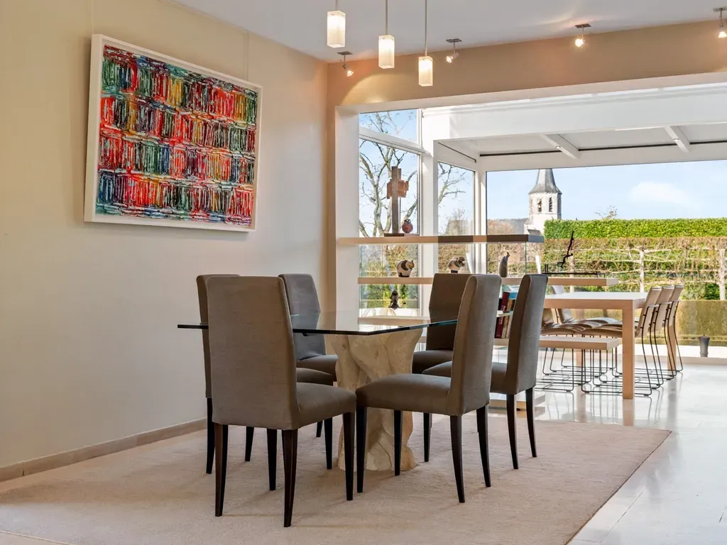 De leefruimtes, uitgerust met vloerverwarming, genieten dankzij grote raampartijen van een overvloed aan natuurlijk licht en een open zicht op de tuin. De eerste leefruimte beschikt over een gezellige zithoek rond het cassettevuur en biedt een mooi uitzicht op het groen. Aansluitend bevindt zich de ruime eetplaats.